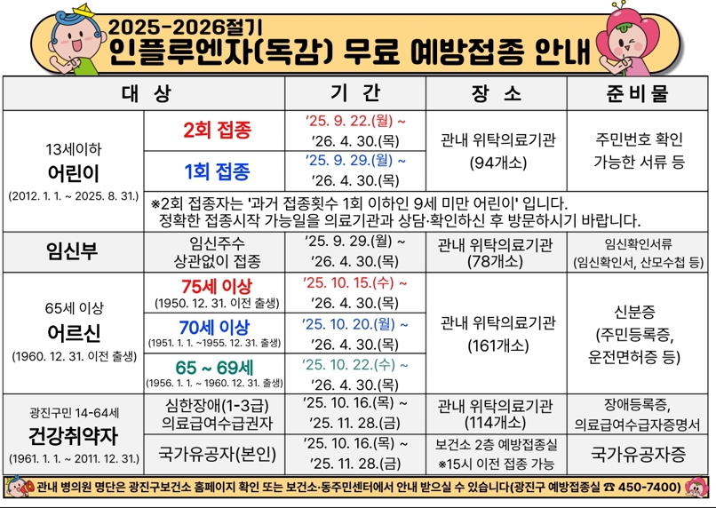 광진구는 겨울철 호흡기 감염병 확산을 예방하고 구민 건강을 보호하기 위해 인플루엔자 무료 예방접종을 실시한다.대상은 ▲6개월 이상 13세 이하 어린이 ▲임신부 ▲65세 이상 어르신 ▲장애인 등 건강취약계층이다. 내년 4월까지 나이와 접종력에 따라 순차적으로 접종을 진행한다.어린이 중 2회 접종대상자(과거 접종 횟수 1회 이하인 9세 미만 어린이)는 9월 22일부터, 1회 접종대상자는 9월 29일부터 접종할 수 있다. 임신부는 주수와 관계없이 9월 29일부터 가능하다.어르신은 연령대별로 접종 시작일이 다르다. 75세 이상은 10월 15일, 70~74세는 10월 20일, 65~69세는 10월 22일부터다.▲심한 장애(1~3급) ▲의료급여수급권자 ▲국가유공자(본인) 등 14~64세 건강 취약 구민은 오는 10월 16일부터 11월 28일까지 접종할 수 있다.구는 구민의 접종 편의를 높이기 위해 총 160여 개소의 관내 위탁의료기관을 지정했다. 기관 목록은 질병관리청 ‘예방접종도우미’ 누리집 또는 광진구청 누리집에서 확인할 수 있다. 국가유공자는 보건소 2층 예방접종실에서 접종이 가능하다. 대상자별로 아기수첩, 신분증, 임신확인서, 국가유공자증 등 관련 증빙 서류를 지참해야 한다.김경호 광진구청장은 “인플루엔자는 전염성이 높아 빠르게 확산하는 질병으로, 예방이 가장 효과적인 방어 수단”이라며, “특히 감염 취약계층일수록 제때 접종하는 것이 중요하다. 구민 여러분께서는 가까운 위탁의료기관을 방문해 안전하게 예방접종 하시기를 바란다”고 밝혔다.한편, 구는 어르신 대상포진 예방접종 지원도 확대한다. 기존 65~74세 기초생활수급자에 더해 과거 접종 이력이 없는 75세 이상 어르신 1천 명을 대상으로 대상포진 생백신 접종을 선착순 지원한다. 9월 25일부터 유선 사전 예약(02-450-7400) 후, 29일부터 보건소 2층 모자건강센터 예방접종실에서 접종할 수 있다.