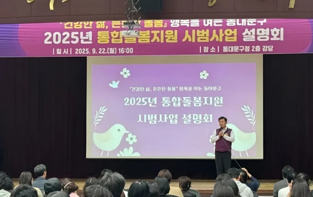 서울 동대문구는 지난 22일 지역 내 민간 유관기관 관계자 150여명을 대상으로 ‘통합돌봄지원 시범사업’ 설명회를 성공적으로 개최했다.이번 행사는 동대문구가 추진 중인 통합돌봄지원 시범사업에 대한 이해도를 높이고, 민관 협력체계 구축을 강화하기 위해 마련됐다. 설명회에서는 서울시복지재단 통합돌봄지원팀장이 ‘지역사회 통합돌봄의 이해와 과제’를 주제로 강의를 진행했다. 강의는 통합돌봄 추진배경, 돌봄통합지원법 주요 내용, 추진체계 및 절차 등으로 구성돼 참석자들에게 통합돌봄 정책 전반에 대한 체계적인 이해를 제공했다.특히, 우리나라에서 빠르게 진행되고 있는 고령화와 이에 따른 사회적 돌봄 수요의 증가 현상을 중심으로 통합돌봄의 필요성을 깊이 있게 설명해 참석자들로부터 큰 공감과 호응을 얻었다. 이를 통해 참석자들은 통합돌봄 사업의 중요성과 필요성에 대해 한층 더 깊이 이해할 수 있는 뜻깊은 시간을 가졌다.또한, 설명회에서는 동대문구가 구축하고 있는 협력체계 및 연계방안에 대해서도 상세히 안내했다. 동대문구는 지역 내 보건, 의료, 건강, 요양, 돌봄, 주거 등 다양한 분야의 민간 및 공공기관과 긴밀한 협력 네트워크를 구축해 대상자의 욕구에 맞춘 맞춤형 지원을 제공하며, 돌봄의 공백을 최소화할 계획이다.이필형 동대문구청장은 “이번 설명회를 통해 통합돌봄사업의 추진방향과 현황을 공유하고, 민간기관과의 협력 기반을 강화할 수 있었다.”라며 “지역사회 맞춤형 돌봄 서비스 제공을 위해 앞으로도 최선을 다하겠다.”라고 밝혔다.한편, 동대문구는 보건복지부와 서울시 공모사업에 선정되어 2026년 3월 사업 시행에 앞서 체계 구축을 위해 시범사업을 진행하고 있다. 시범사업은 지역 내 돌봄이 필요한 구민이 보다 건강한 삶을 영위할 수 있도록 지원하는 데 중점을 두고 있으며, 민간 기관과의 긴밀한 협력과 효율적인 서비스 연계를 위해 힘쓰고 있다.
