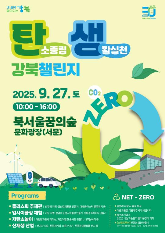 서울 강북구는 오는 9월 27일 오전 10시부터 오후 4시까지 북서울꿈의숲 일대에서 ‘탄생 강북 챌린지(탄소중립 생활실천 강북 챌린지)’와 ‘2025 나눔과 순환의 즐거운 장터’를 개최한다.탄소중립과 자원순환 행사를 연계해 추진함으로써 주민들의 공감대를 형성하고 환경정책에 대한 실천 의지를 확산하는 계기가 될 것으로 기대된다.‘탄생 강북 챌린지’의 ‘탄생’은 ‘탄소중립 생활실천’의 줄임말로 이번 행사는 탄소중립 실천 약속을 비롯해 플라스틱 주제관 등 5개 마당 35개 체험 프로그램으로 구성된다.탄소중립 실천 약속은 참가자들이 ‘나만의 실천 약속’을 작성해 지구 조형물에 부착하고 탄소중립을 약속하는 방식으로 운영된다. 플라스틱 주제관에서는 플라스틱 과다 사용의 심각성을 알리고 소비 감축을 유도하는 전시·체험이 마련된다. 또한 놀이·체험·산업·홍보 마당에서는 재활용품을 활용한 키링 만들기, 태양광 RC카 레이싱, 자전거 발전 솜사탕 만들기, 전기·수소차 시승 및 저탄소 제품 전시, 환경 정책 홍보 등 35개의 다양한 프로그램이 운영된다.‘2025 나눔과 순환의 즐거운 장터’는 생활 속 재사용과 나눔을 실천하는 장으로, 아나바다존에서 중고물품 교환이 이뤄지고 체험존에서는 재활용 체험활동으로 환경보호 활동을 경험할 수 있다. 캠페인존에서는 자원순환의 필요성을 알리는 홍보 활동이 진행되며, 홍보마당에서는 다 쓴 건전지 20개를 가져오면 새 건전지 2개로 교환해 주는 이벤트와 음식물쓰레기 감량을 위한 잔반 제로 챌린지가 진행된다. 무대에서는 어린이 마술쇼, 버스킹, 마임 공연 등 온 가족이 함께 즐길 수 있는 다양한 공연이 이어진다.강북구는 두 행사의 연계 운영을 통해 자원순환과 탄소중립 실천을 동시에 이끌어내는 시너지 효과를 기대하고 있다. 이를 통해 세대가 함께 참여하는 환경 실천의 장을 마련하고, 지역사회 전반에 친환경 생활문화를 확산하는 계기가 될 것으로 보고 있다.이순희 강북구청장은 “이번 두 행사는 단순한 체험을 넘어 자원순환과 탄소중립을 함께 실현하는 강북구의 대표 환경 축제가 될 것”이라며 “주민 여러분의 많은 관심과 참여를 부탁드린다”고 말했다.