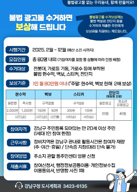 꿈이 모이는 도시, 미래를 그리는 강남구가 불법 유동광고물 근절을 위해 운영 중인 ‘수거보상제’의 참여 인원을 대폭 확대한다. 구는 주민 약 60명을 새롭게 모집해 더 많은 주민이 직접 거리 정비에 나설 수 있도록 했다.수거보상제는 주민이 도로변에 무분별하게 부착된 현수막, 벽보, 전단지 등을 수거하면 수량에 따라 보상금을 지급하는 제도다. 불법광고물이 도시 미관을 해치고 보행 안전을 위협하는 문제를 주민 스스로 해결하자는 취지로, 강남구는 2018년부터 시행해 오고 있다.올해 상반기 주민들이 수거한 불법광고물은 4만 6875만 건으로, 매년 건수가 점차 줄어드는 상황이다. 이에 구는 제도의 실효성을 높이고 생활환경 개선 효과를 극대화하기 위해 참여 대상을 기존 21명에서 약 80명으로 대폭 확대하기로 했다.보상금은 월 최대 80만 원 한도에서 현수막 1장당 1,000~2,000원, 벽보 50~150원, 스티커 100~200원, 전단지 20~40원이 지급된다. 주말에는 현수막과 벽보에 한해 평일의 2배 금액이 적용된다. 정비는 강남구 관내에서 이뤄지며, 활동 시간은 개인 일정에 맞춰 탄력적으로 운영된다.강남구에 거주하는 만 20세 이상 주민 누구나 참여할 수 있으며, 개인뿐 아니라 지역단체도 참여할 수 있다. 참여를 원하는 분은 주소지 관할 동 주민센터에서 신청할 수 있다. 선발 결과는 동 주민센터에서 개별 통보하며, 선발된 참여자는 안전 수칙과 수거 방법 등 사전 교육을 이수한 뒤 단속원증을 발급받아 본격적인 거리 정비 활동에 나선다.한편, 구는 불법광고물 정비반을 연중 상시 운영하며, 선정성 전단지 근절을 위해 특별사법경찰관을 배치해 살포자를 단속하고 자동경고발신시스템을 활용하는 등 다각도의 대응을 펼쳐오고 있다.조성명 강남구청장은 “불법광고물은 주민 생활과 밀접한 문제인 만큼 이번 참여 확대를 통해 정비 효과를 높이고, 쾌적하고 안전한 도시환경을 조성해 나가겠다”며 “앞으로도 주민이 체감할 수 있는 도시환경 정책을 지속적으로 추진하겠다”고 밝혔다.