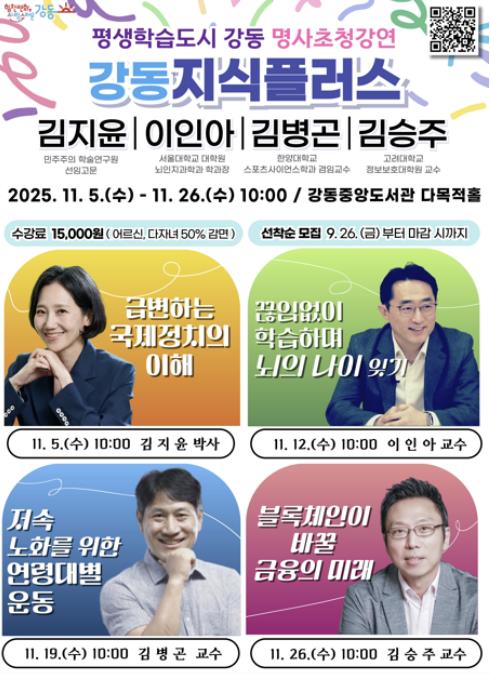 강동구는 오는 11월 개최되는 명사초청특강 `강동지식플러스`의 참여자를 오는 26일부터 모집한다고 밝혔다.“급변하는 미래, 지속 가능한 삶”을 주제로 열리는 이번 특강은 11월 5일부터 26일까지 매주 수요일 오전 10시, 총 4회에 걸쳐 강동중앙도서관 다목적홀에서 진행될 예정이다.강연은 정치학자 김지윤 박사의 ‘급변하는 국제정치의 이해’를 시작으로, 서울대학교 뇌인지과학과 이인아 교수의 ‘끊임없이 학습하며 뇌의 나이 잊기’, 한양대학교 스포츠사이언스학과 김병곤 교수의 ‘저속 노화를 위한 연령대별 운동’, 마지막으로 고려대학교 정보보호대학원 김승주 교수의 ‘블록체인이 바꿀 금융의 미래’가 차례로 이어진다.이수희 강동구청장은 “급변하는 사회 속에서 새로운 지적 통찰과 지속 가능한 삶의 지혜를 나누는 장으로 마련했다”라며 “서울 자치구 최대이자 인문예술 특화 도서관인 강동중앙도서관에서 열리는 특강인 만큼, 구민들이 미래 사회를 준비할 수 있는 귀중한 지적 자산을 얻게 되길 기대한다”라고 말했다.