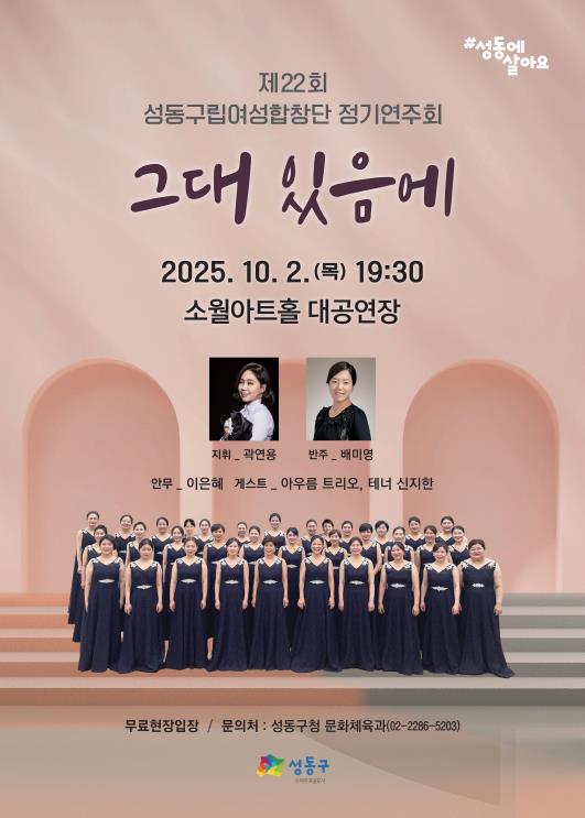 서울 성동구는 오는 10월 2일 저녁 7시 30분 소월아트홀에서 성동구립 여성합창단 `제22회 정기 공연`을 개최한다고 밝혔다. 공연 부제는 `그대 있음에`로 가을밤, 구민들에게 사랑과 위로의 하모니를 선사할 예정이다.1991년 창단한 성동구립 여성합창단은 성동구를 대표하는 문화사절단으로, 2025년 제3회 남도전국합창대회 대상 수상 등 다수의 외부 무대에서 실력을 인정받고 있다. 올해 제22회 정기공연은 구민들에게 수준 높은 문화예술 향유 기회를 제공하고, 합창단원 간의 화합을 다지는 특별한 자리로 마련됐다.특히 이번 공연에는 테너 신지한과 감성 클래식 앙상블 ‘아우름 트리오’가 협연진으로 무대에 올라, 한층 풍성한 음악적 감동을 선사할 예정이다.또한, 합창단의 진한 감성을 느낄 수 있는 ‘그대 있음에’를 비롯해 제주 바다의 정취를 전달하는 ‘이어도사나’ 등 아름다운 합창과 더불어, 세계적으로 사랑받는 ‘리베르탱고’, ‘10월의 어느 멋진 날’에 등 클래식과 대중음악 등 다채로운 무대를 선보일 예정이다.정원오 성동구청장은 “깊어가는 가을밤, 멋진 하모니로 일상의 쉼과 위로를 전할 성동구립 여성합창단 정기공연에 주민 여러분의 많은 관심과 참여를 부탁드린다”라고 말했다.