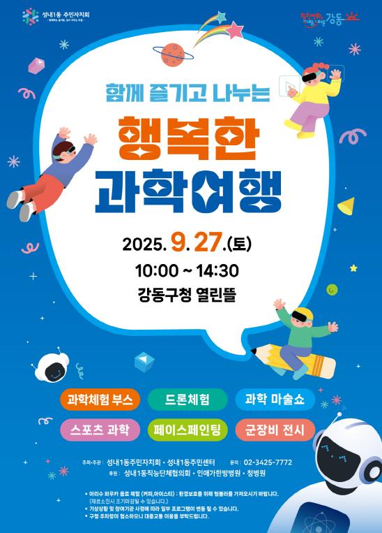 강동구 성내1동은 오는 27일 10시부터 14시 30분까지 강동구청 열린뜰에서 ‘제5회 함께 즐기고 나누는 행복한 과학여행’ 축제를 개최한다고 밝혔다.이번 축제는 성내1동주민자치회와 성내1동주민센터가 주최·주관하고, 성내1동 직능단체협의회가 후원한다. 아울러, 서울성내초등학교 학부모회, 성내중학교 과학동아리, 성내1동어린이집 연합회, 성내종합사회복지관, 성내1동우리동네키움센터, 강동구아동청소년미래본부, 육군 제6019부대 제1대대, 강동인애가한방병원, 청병원 등 다양한 지역자원들이 함께 힘을 모았다.축제에서는 아동과 청소년들이 과학 원리를 쉽고 재미있게 체험할 수 있는 13개 과학 체험 부스가 운영된다. 특히 육군 제6019부대의 협조로 평소 접하기 어려운 군사 장비를 직접 보고 체험할 수 있으며, 레이저사격, 소리로 즐기는 쇼다운 등 스포츠과학 프로그램도 마련된다.또한, 13시 40분부터는 주무대에서 과학과 예술이 어우러진 과학마술쇼를 운영해 아이들의 호기심과 상상력을 자극하고 함께 즐기는 즐거움을 선사할 예정이다.이수희 강동구청장은 “이번 축제는 주민이 주도하고 직능단체, 학교, 어린이집, 군부대 등 지역의 다양한 자원이 함께한 아동·청소년 축제”라며, “준비 과정에서 성숙한 주민자치 역량을 보여준 주민단체 여러분께 감사드리며, 아이들이 과학을 재미있고 친근하게 경험하는 계기가 되기를 바란다”라고 말했다.한편 축제에는 아동·청소년 누구나 참여할 수 있으며, 텀블러를 지참하면 강동수도사업소에서 운영하는 ‘아리수 와우카’의 커피 및 음료를 무료로 제공받을 수 있다. 자세한 사항은 성내1동주민센터로 문의하면 된다.