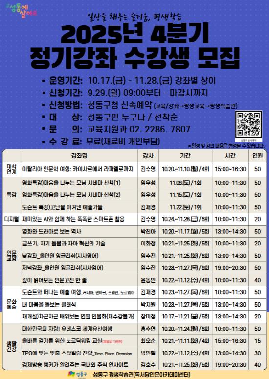 서울 성동구가 2025년 4분기 평생학습관 정기강좌 수강생을 오는 9월 29일(월) 오전 9시부터 성동구청 누리집(홈페이지) 신속예약에서 선착순으로 모집한다.이번 4분기 정기강좌는 대학연계, 디지털, 인문교양, 문화예술, 생활건강 등 구민 삶의 질을 높일 다양한 프로그램으로 구성됐다. 특히, 장애인 인식개선을 주제로 한 특강을 새롭게 마련해 도슨트와 함께 고난을 이겨낸 예술가들을 조명하고, 전문 영화인과 함께 타인의 시선과 감정을 이해하며 공감하는 특별한 시간을 제공한다.이와 함께 AI와 스마트폰, 주식인사이트, 시사영어, 노르딕워킹 등 실생활에 도움이 되는 실전 강의부터 인문고전, 클래식, 유네스코 세계유산 여행, 글쓰기 등 풍성한 예술·문화 강좌까지 구민들의 다양한 학습 욕구를 충족시킬 예정이다.성동구 평생학습관은 분기별로 정기강좌를 운영하며, 매번 높은 관심과 참여를 이끌고 있다. 실제로 지난 3분기 정기강좌에는 14개 강좌에 626명의 수강생이 참여해 평생학습에 대한 뜨거운 열기를 확인할 수 있었다.정원오 성동구청장은 “지적 성장과 자기계발, 공감 능력까지 다양한 배움으로 구민 여러분의 삶에 활력을 더할 수 있도록 앞으로도 수준 높은 강의를 제공하겠다”라고 말했다.