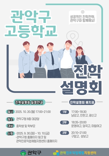관악구가 중학생과 학부모를 대상으로 오는 10월 20일 개최하는 ‘관악구 고등학교 진학설명회’ 참가자를 모집한다. 구는 이번 설명회 개최로 고교 진학을 앞둔 학생과 학부모의 궁금증을 해소하고, 교육과정 등 학교별 특성 비교를 통한 맞춤형 진로, 진학 선택을 지원한다는 방침이다.고입 설명회에는 관내 일반고 8개교가 참여해 학교 소개를 비롯한 ▲입학전형 요강 ▲교육 프로그램 ▲특화 활동 및 동아리 ▲입시 결과 등을 안내할 예정이다. 설명회는 총 3부로 나뉘어 진행되며 1부는 남강고, 인헌고, 광신고, 2부는 문영여고, 당곡고, 미림여고, 3부에서는 구암고와 성보고 순으로 진학 설명회를 실시한다. 설명회가 끝난 뒤에는 질의 응답시간도 마련될 예정이다.설명회 신청 기간은 오는 9월 30일부터 10월 10일까지이다. 참여를 희망하는 학생과 학부모는 관악진로직업체험지원센터 홈페이지에서 전체 학교 또는 원하는 학교별로 신청하면 된다.관악구 고등학교 진학설명회는 10월 20일 17시에 관악구청 8층 대강당에서 개최될 예정이다. 고입 설명회에 대한 자세한 사항은 관악진로직업체험지원센터 또는 관악구청 교육지원과로 문의하면 된다.박준희 관악구청장은 “올해 처음 고교학점제가 전면 도입되어 학생과 학부모의 고입 선택에 대한 고민이 클 것으로 예상된다“라며 ”이번 진학설명회에서 관내 고등학교에 대한 정보를 한눈에 파악하고, 고입 전반에 대한 이해도를 높이는 기회가 되기를 바란다“라고 말했다.