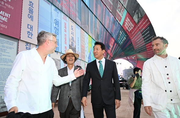 오세훈 서울시장은 26일 오후 6시 30분 열린송현 녹지광장(종로구 송현동)에서 진행된 `제5회 서울도시건축비엔날레` 개막식에 참석해 54일간 서울 도심을 장식할 글로벌 건축 축제의 시작을 알렸다. `서울비엔날레는’ 세계 도시가 함께 도시문제 해법을 고민하고 사람을 위한 건축문화를 교류하는 국내 최초 도시건축 분야 국제행사로 11월 18일까지 열린송현 녹지광장과 서울도시건축전시관 등에서 ‘매력 도시, 사람을 위한 건축’을 주제로 개최되며 이번 전시는 영국 출신 세계적 디자이너 토마스 헤더윅이 총감독을 맡았다. 이날 개막식에는 오세훈 서울시장과 토마스 헤더윅 총감독을 비롯해 마옌송, 스테판 웹스터 등 국내외 유명 건축가와 주한 외교사절, 시민 등 500여 명이 참석했다. 개막식에 앞서 오 시장은 토마스 헤더윅 총감독과 함께 서울도시건축전시관과 광화문광장을 차례로 방문해 전시 작품들을 둘러봤다. 이어 열린송현 녹지광장으로 이동해 철골과 스틸패널로 만든 대형조형물 ‘휴머나이즈 월(Humanise Wall)’과 ‘일상의 벽(Walls of Public Life)’을 차례로 관람했다. ‘휴머나이즈 월’은 총감독과 창작커뮤니티 9개 팀이 전 세계 400여 개 건축물 이미지를 스틸패널 총 1,428장으로 구성한 90m, 높이 15m 규모 작품이다. ‘일상의 벽’은 셰프 에드워드 리(Edward Lee), 英 패션 디자이너 스텔라 맥카트니(Stella McCartney) 등 전 세계 건축가와 예술가 등이 참여한 24개의 작품으로 구성된다. 오 시장은 개막식에서 “이제 서울은 과거 회색 도시에서 벗어나, 걸어 다니며 건축물을 볼 수 있고 눈높이에서 건축작품을 즐길 수 있는 생활 속에서 건축을 추구하는 단계에 이르렀다”며 “앞으로도 사람을 위한 건축을 통해 살고 싶은 도시, 즐기는 도시, 생활 속에 즐거움이 느껴지는 도시를 만들겠다”고 밝히며 개막을 선언했다. 이어진 비엔날레상 시상식에서 오 시장은 ‘일상의 벽’에 참여한 ‘요앞건축사사무소’에 비엔날레상을, 전시 경험을 조각보 형태로 표현한 ‘사랑한다면 입을 수 있어요팀’에 특별상을 시상했다. 한편, 지난 2017년 첫 개최해 올해로 5회째를 맞는 서울도시건축비엔날레는 현재까지 약 538만 명(온라인 포함)의 관람객을 기록하며, 전시를 넘어 도시건축을 논의하는 국제적 플랫폼으로 자리 잡았다.
