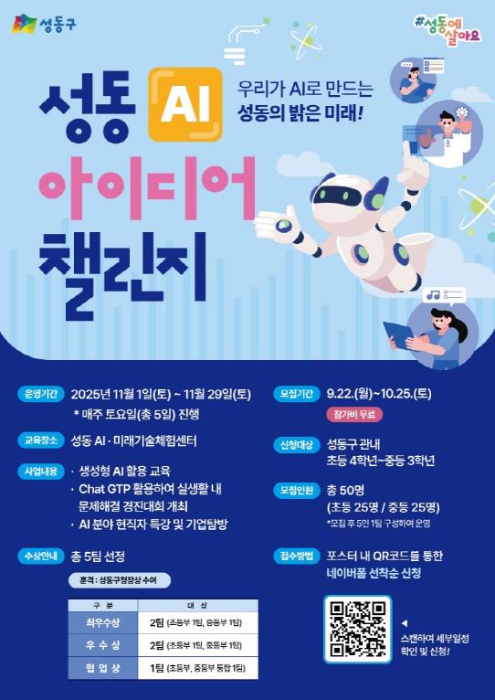 서울 성동구는 생성형 인공지능(챗GPT)을 활용해 일상 속 문제를 해결할 아이디어를 발굴하는 `2025 성동 AI 아이디어 챌린지`를 오는 11월 한 달간 운영하고, 참가자를 10월 25일까지 선착순 모집한다고 밝혔다.‘성동 AI 아이디어 챌린지’는 초등·중학생들이 챗GPT로 대표되는 생성형 인공지능(AI)을 올바르게 활용하는 방법을 익히고, 이를 활용해 새로운 창작물을 직접 함께 만들어보며 미래 기술에 대한 활용 역량을 강화할 수 있도록 마련됐다.이번 챌린지는 성동구 관내 초등학교 4학년부터 중학교 3학년까지 총 50명의 학생을 대상으로 진행된다. 참가자들은 11월 한 달간 매주 토요일 성동 AI·미래기술체험센터에서 교육을 이수하고, ‘AI 활용 경진대회’에 참여하게 된다.챌린지는 생성형 인공지능(AI) 활용 교육, 팀별 아이디어 회의 및 발표 준비, 경진대회, 인공지능(AI) 분야 기업 탐방 총 4단계로 구성되어 있다.먼저, 5인 1팀(총 10팀)을 구성하고, 생성형 인공지능(AI) 활용 사례와 챗GPT 활용에 대한 교육을 받게 된다. 이어 교육 전문가 멘토의 도움을 받아 성동구의 환경, 교육, 문화 등 다양한 주제에 대한 해결 방안을 팀별로 기획하고, 발표 자료를 제작한다.제작한 자료는 11월 22일 열리는 경진대회에서 팀별 발표 후 평가 및 시상식이 진행되며, 상위 5개 팀(최우수 2팀, 우수 2팀, 협업상 1팀)에게는 성동구청장상을 수여할 예정이다.마지막으로 11월 29일에는 글로벌 소프트웨어 기업 오라클(Oracle) 현직자 특강 및 기업 탐방을 통해 인공지능(AI) 분야의 진로를 탐색하는 기회를 제공한다.챌린지에 참여를 원하는 성동구 학생은 오는 10월 25일까지 홍보물에 게재된 정보무늬(QR코드)를 통해 신청하면 되며, 참가 접수는 선착순으로 진행된다.정원오 성동구청장은 “이번 챌린지를 통해 아이들이 AI를 활용해 우리 사회에 기여하는 방법을 배우고, 미래 인재로 성장하는 계기가 되기를 바란다”며, “앞으로도 변화하는 미래 사회에 대비할 수 있는 다양한 기회를 만들어 나가겠다”고 말했다.