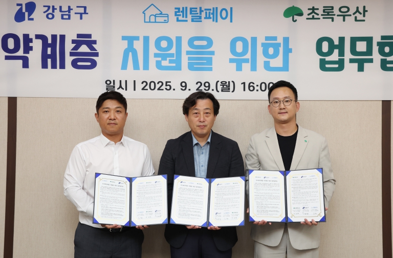 꿈이 모이는 도시, 미래를 그리는 강남구가 9월 29일 렌탈페이, 초록우산과 함께 주거취약계층 지원을 위한 3자간 업무협약(MOU)을 체결했다.이번 협약은 공공예산만으로는 한계가 있는 주거취약계층 지원에 민간 자원을 연계해 실질적인 주거 안정을 돕기 위해 마련됐다. 시설퇴소 아동, 자립준비청년, 저소득 가정, 월세 체납 등으로 명도소송 중인 가구, 임시거주 등 주거 불안으로 어려움을 겪는 다양한 사람들이 지원 대상이다.협약에 따라 강남구는 강남주거안심종합센터 주거상담소와 협력해 실질적으로 필요한 대상자를 발굴·추천하고, 렌탈페이는 월 100만원 씩 연간 1,200만 원을 후원하고, 향후 회사의 영업이익 손익분기점 매출 일부를 추가 기부할 예정이다. 초록우산은 후원 캠페인을 운영하고 이사비·정착비·가전·가구 지원 등 맞춤형 주거 서비스를 제공한다. 세 기관은 실무 협의를 통해 대상자 선정과 지원 절차를 체계적으로 운영할 계획이다.조성명 강남구청장은 “이번 협약은 복지 사각지대에 놓인 이웃들에게 안정된 주거 기반을 마련해 주는 뜻깊은 협력”이라며 “앞으로도 민·관이 함께하는 복지 모델을 확산시켜, 구민들이 더 안정된 환경에서 새로운 희망을 이어갈 수 있도록 노력하겠다”고 밝혔다.