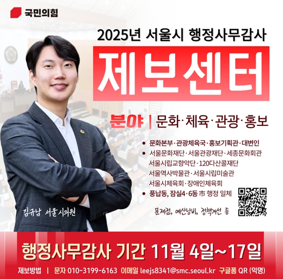 김규남 서울시의원(송파1·국민의힘)은 오는 11월 4일부터 17일까지 열리는 2025년도 서울시 행정사무감사를 앞두고 시민 참여를 위한 제보센터를 운영한다고 30일 밝혔다. 이번 제보센터는 서울시와 산하기관의 문제점, 예산 낭비, 비리, 정책 개선 필요 사항 등을 시민들로부터 직접 접수받아 감사 현장에서 다루기 위한 취지로 마련됐다. 특히 문화·체육·관광·홍보 분야가 집중 감사 대상이며, 시민 생활과 밀접한 사안부터 대규모 정책에 이르기까지 폭넓게 제보할 수 있다. 제보 대상 기관은 ▲서울시 문화본부 ▲관광체육국 ▲홍보기획관 ▲대변인실을 비롯해 산하기관인 ▲서울문화재단 ▲서울관광재단 ▲세종문화회관 ▲서울시립교향악단 ▲120다산콜재단 ▲서울역사박물관 ▲서울시립미술관 ▲서울시체육회 ▲서울시장애인체육회 등이다. 또한 지역 현안에 대한 위법·부당한 서울시 행정도 제보할 수 있다. 서울 전역이 대상이며, 특히 송파구 풍납1·2동과 잠실4·6동이 집중 제보 지역이다. 제보센터는 9월 30일부터 10월 31일까지 운영되며, 문자, 이메일, 구글폼 등 다양한 방법으로 참여가 가능하다. 김 의원은 “이번 제보센터 운영을 통해 시민의 목소리를 직접 청취해 행정사무감사 과정에 적극 반영하겠다.”라며 “시민 여러분의 소중한 제보가 서울시 행정을 개선하는 밑거름이 될 것”이라면서, “예산 낭비와 불합리한 정책을 바로잡는 데 최선을 다하겠다.”라고 말했다.