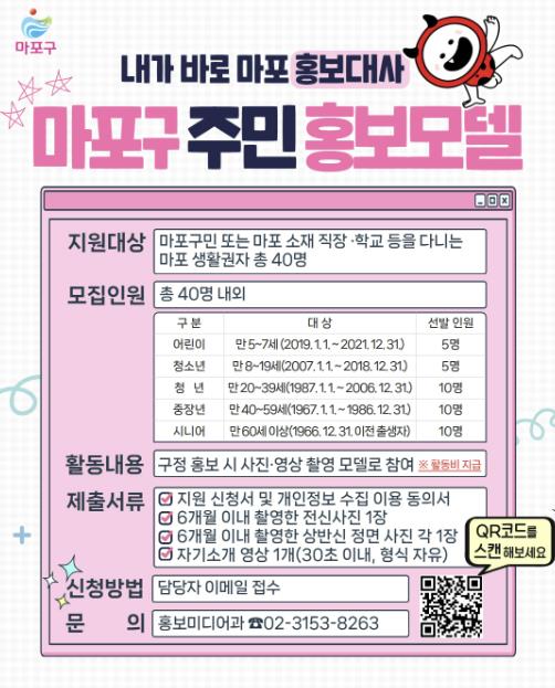 마포구는 10월 1일부터 10월 17일까지 ‘마포구 주민 홍보모델’을 모집한다.올해 처음으로 운영하는 ‘마포구 주민 홍보모델’은 다양한 세대와 연령대의 주민이 구정 홍보에 직접 참여할 기회를 제공하고 구민 친밀감과 소통행정을 강화하고자 추진됐다.모집대상은 마포구민이거나 마포구 소재 직장인 또는 학생 등으로, 마포구 생활권자라면 누구나 지원할 수 있다.모집 인원은 총 40명으로, 2026년부터 본격적으로 활동을 시작함에 따라 내년도 기준 5~7세 어린이 5명, 8~19세 청소년 5명, 20~39세 청년 10명, 40~59세 중장년 10명, 60세 이상 시니어 10명을 선정한다.선발된 주민 홍보모델은 2년간 마포구 소식지 ‘내고장마포’와 마포구 SNS, 유튜브 마포방송, 마포구 블로그 등에서 마포구 주요 정책과 축제, 행사, 명소 등을 소개하는 사진·영상 모델로 활동하게 된다.마포구는 1차 서류심사와 2차 전문가 심사를 거쳐 10월 말 최종 홍보모델을 선정하고, 11월 위촉식을 진행할 예정이다.박강수 마포구청장은 “다양한 세대가 함께 어우러져 마포의 매력을 널리 알리고, 구민과 더 가까이 소통할 수 있기를 기대한다”라며 “마포구는 구민이 직접 마포의 얼굴이 되고 이야기를 전하는 만큼 더욱더 책임 있는 구정을 펼쳐나가겠다”라고 말했다.