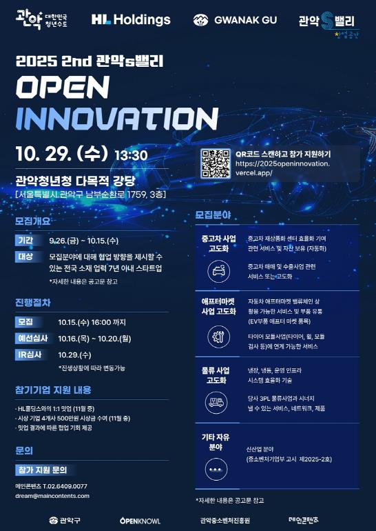 관악구가 자동차, 물류 분야 글로벌 네트워크를 보유한 ‘HL홀딩스’와 함께 ‘2025 제2회 관악S밸리 오픈 이노베이션’에 참가할 기업을 모집한다.오픈 이노베이션은 기업이 필요로 하는 기술과 정보를 외부에서 도입하고, 동시에 기업 내부 자원과 기술을 외부와 공유하여 새로운 제품과 서비스를 만들어내는 전략이다. 이번 관악S밸리 오픈 이노베이션에는 자동차 부품, 물류, 유통 분야에서 글로벌 경쟁력을 가진 ‘HL홀딩스’가 파트너사로 참여해, 자사의 사업 분야와 연계 가능성이 높은 혁신 스타트업을 함께 발굴할 예정이다.모집 대상은 전국의 7년 이내 창업기업(신산업 분야는 10년 이내)과 벤처기업이다. 기술 수요 분야는 ▲중고차 사업 ▲자동차 애프터마켓 서비스 ▲물류, 유통 ▲기타 자유 제안 분야이다.참가를 원하는 기업은 10월 15일 오후 4시까지 공식 홈페이지에서 IR 피치덱(Pitch Deck, 투자 유치 목적 프레젠테이션)과 필수 서류를 제출하면 된다.서류 심사를 거쳐 선정되는 8개 기업은 오는 29일 관악S밸리 오픈이노베이션 본선 심사에서 IR 발표를 통해 혁신성과 사업성을 평가받게 된다. 본선에 진출 기업 전원에는 관악구청장상이 수여되며, 우수 기업으로 선정된 최종 4개 사에는 각 500만 원의 상금과 HL홀딩스 실무진과의 1:1 밋업 기회가 추가로 제공된다.한편 구는 2023년부터 ‘관악S밸리 오픈이노베이션’을 개최, 지역 내 기술 기반 스타트업과 대·중견기업의 연결을 통해 ▲기업 간 협업 ▲기술 실증 ▲투자 연계 등 종합적인 지원을 제공하고, 창업 생태계 성장을 도모해 왔다.지난해에는 롯데홈쇼핑, 네이버클라우드와 민관 공동 오픈이노베이션을 본격 추진하고, 올해 7월에는 글로벌 에너지 기업 S-OIL과 협력해 스타트업의 혁신 기술과 파트너사의 확장성, 자원을 결합해 의미있는 협력 모델을 구축해 왔다.아울러 구는 관악S밸리와 협력하여 ▲316억 원 규모 벤처펀드 조성 ▲CES 참가 지원 및 혁신상 수상 기업 배출 ▲서울대와 함께하는 2026년 캠퍼스타운 사업 3회 연속 선정 등 벤처, 창업기업의 성장을 다각도로 지원하고 있다.박준희 구청장은 “관악S밸리는 대기업과의 협력으로 혁신 스타트업의 기술 실증과 사업화 기회를 본격적으로 확대해 나가고 있다“라며 “앞으로도 창업 생태계의 성장과 도약을 위해 인프라와 네트워크를 적극 개방하고 협력을 확대하겠다”라고 밝혔다.