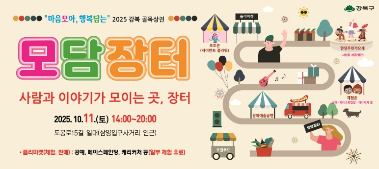 서울 강북구는 오는 11일 오후 2시부터 8시까지 삼양입구사거리 인근 도봉로15길 일대에서 ‘2025 강북 골목상권 모담장터’를 개최한다고 밝혔다. 이번 행사는 관내 여러 상인회가 힘을 모아 마련한 축제로, 골목상권의 자생력을 키우는 동시에 주민과 상인이 함께 어울리는 화합의 장이 될 것으로 기대된다. 행사장에서는 골목상권의 특색 있는 먹거리와 공예품을 판매하는 플리마켓을 비롯해, 딱지치기·달고나 만들기와 같은 추억의 놀이, 페이스페인, 캐리커처, 파크골프, 공예 체험 등 가족 모두가 즐길 수 있는 다채로운 프로그램이 마련된다. 또한 버스킹 공연, 댄스, 악기 연주, 마술 등 문화예술 무대와 함께, 현장 접수를 통해 누구나 참여할 수 있는 주민 가요제도 열려, 추석 연휴 이후 지역경제에 활력을 불어넣을 예정이다. 이순희 강북구청장은 “이번 ‘모담장터’가 상인들에게는 자생력을 다지는 기회가 되고, 주민들에게는 강북의 다양한 골목상권을 경험하는 뜻깊은 시간이 되기를 바란다”라며 “앞으로도 활기 넘치는 골목상권 조성을 위해 구 차원의 지원을 아끼지 않겠다”라고 말했다.
