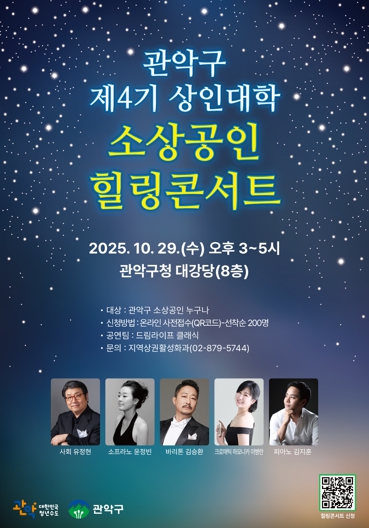 관악구는 오는 10월 29일 오후 3시, 구청 8층 대강당에서 관내 소상공인을 위한 힐링콘서트를 개최한다.이번 콘서트는 ‘제4기 관악구 상인대학’ 교육과정의 일환으로, 상인대학 수강생을 비롯해 지속되는 경기침체로 인해 위축된 관내 소상공인들을 위로하고자 구가 마련했다.총 2시간 동안 진행되는 이번 콘서트는 성악가와 악기연주자가 출연해 클래식 음악에 스토리텔링을 접목, 소상공인들에게 꿈과 희망의 메시지를 전하며, 감동과 위로를 선사한다.신청은 10월 1일(수)부터 QR코드를 통한 온라인 사전 접수로 진행되며, 선착순 200명까지 신청이 가능하다.구는 지난 8월 변화하는 소비 환경에 맞춰 소상공인의 경쟁력을 키우고 매출 증대를 돕기 위해 ‘제4기 관악구 골목상권 상인대학’ 참여 소상공인을 모집한 바 있다. 이번 4기는 변화하는 소비 환경에 맞춰 ‘디지털 온라인 마케팅 교육’ 분야를 대폭 강화하고, 상인들의 요구에 따라 ‘소비자 심리 기반 경영 전략 수립 교육’을 도입하는 등 맞춤형 교육 프로그램으로 운영됐다.한편, 구는 지난 9월 ▲소상공인 아트테리어 사업 ▲전통시장, 상점가 활성화 행사 지원 등 하반기 추경 예산 137억 4000만 원을 편성하는 등 민생회복과 소상공인 지원에 총력을 다하고 있다.박준희 구청장은 “이번 힐링콘서트로 소상공인들이 바쁜 일상 속에서 잠시나마 벗어나, 지쳐있는 심신을 치유하는 소중한 시간이 됐으면 한다.”라며, “어려운 시기를 소상공인과 함께 극복할 수 있도록 관악구도 지원을 아끼지 않겠다”라고 말했다.