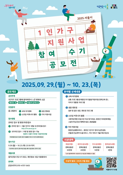 서울시가 1인가구 지원사업의 성과를 공유하고 참여자들의 생생한 목소리를 담아내기 위해 `2025년 1인가구 지원사업 참여 수기 공모전`을 개최한다. 이번 공모전은 올 한해 서울시 1인가구지원사업에 참여 경험이 있는 1인가구라면 누구나 참여 가능하며, 접수는 10월 23일(목)까지 진행된다. 신청·접수는 서울 1인가구포털을 통한 온라인 접수로 가능하며, 컴퓨터 사용이 어려운 1인가구는 자치구 1인가구지원센터로 우편 발송이나 방문을 통한 오프라인 접수도 가능하다. 체험 수기는 1인가구 포털에서 양식을 내려받아 A4 2쪽 내외 분량으로 작성한 한글파일을 제출하면 된다. 공모 주제는 ‘서울시 1인가구 지원사업 참여 경험담’으로, 올해 1인가구 사업에 참여하며 생긴 일상의 변화, 새롭게 깨닫게 된 점, 좋았던 점 등을 자유롭게 담아내면 된다. 공모는 ▴교육·여가문화 ▴상담·멘토링 ▴소모임·커뮤니티 활동 ▴기타 지원사업의 4개 분야로 진행된다. 1인가구지원센터 프로그램 이용자뿐 아니라, 서울시 병원안심동행서비스·중장년 정리수납 컨설팅·전월세 안심계약 도움서비스 등 서울시의 1인가구 지원사업에 참여한 시민 누구나 공모에 참여할 수 있다. 응모작은 심사를 거쳐 ▴대상(1명) ▴최우수상(4명) ▴우수상(8명) ▴장려상(14명)까지 총 27편의 수상작을 선정한다. 수상작은 추후 사례집으로 제작·배포되어 향후 1인가구 지원사업 홍보 및 정책자료로 활용한다는 방침이다. 심사는 내·외부 심사위원이 참여하며, 작품구성력, 진정성, 독창성, 배움과 성장, 활용성 등 5개 항목(총 100점)으로 평가한다. 최종 수상작은 11월 중순 경 서울 1인가구 포털을 통해 발표할 예정이며, 수상자에는 개별 통보한다. 공모전과 관련된 자세한 내용은 서울 1인가구 누리집에서 확인하거나 공모전 사무국으로 문의하면 된다. 김은희 서울시 1인가구지원과장은 “이번 공모전은 서울시의 1인가구지원사업이 시민의 삶에 가져온 변화를 직접 확인할 수 있는 좋은 기회”라며, “많은 1인가구가 참여해 자신의 경험을 나누고, 이를 바탕으로 향후 1인가구 사업이 더 나은 방향으로 발전하길 기대한다”라고 말했다.
