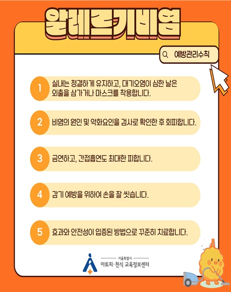 아침저녁 기온차가 크고 건조해지는 환절기에는 알레르기비염 관리에 각별한 주의가 필요하다. 건강보험심사평가원 자료에 따르면 비염환자가 봄철(4~5월)보다 가을철(9~10월)에 더 많은 것으로 나타났으며, 이 시기에 증상이 심해질 수 있어 조기진단과 예방적 생활관리가 중요하다. 이처럼 환절기에 알레르기비염이 심해지는 이유는 급격한 온도 변화와 같은 외부 자극으로 인해 호흡기가 예민해지기 때문이다. 알레르기비염은 집먼지진드기, 동물의 털, 꽃가루 등 특정 물질(항원)이 코 점막에 들어와 염증을 일으키는 질환이다. 일교차가 커지고 날씨가 건조해지면 점막이 예민해져 항원이 쉽게 침투한다. 주요 증상으로는 코막힘, 재채기, 맑은 콧물이며, 코·목·눈·귀의 가려움이 동반되기도 한다. 감기와 증상이 비슷해 혼동하기 쉽지만 발열은 거의 없으며 증상이 일주일 이상 지속되는 특징이 있다. 알레르기비염은 잦은 재발과 증상 악화로 일상생활에 불편을 초래할 뿐만 아니라, 어린이와 청소년에게 학습장애, 활동제약, 수면장애 등을 유발할 수도 있다. 효과적인 치료와 예방을 위해서는 알레르기 원인과 악화 요인을 조기에 파악하는 것이 중요하다. 조기 진단과 더불어 일상생활에서의 작은 실천만으로도 증상 완화와 예방에 큰 도움이 된다. 알레르기 비염 예방관리 수칙은 ①실내 청결 유지 및 대기오염이 심한 날에는 외출을 삼가거나 마스크 착용 ②비염의 원인 및 악화요인을 검사로 확인한 후 회피 ③금연과 간접흡연 피하기 ④감기 예방을 위한 손 씻기 ⑤효과와 안전성이 입증된 방법으로 꾸준히 치료하는 것이다. 서울시는 `아토피·천식 교육정보센터`를 운영하며 알레르기비염, 아토피피부염, 천식 등 다양한 알레르기 질환에 대한 무료 상담을 제공하고 있다. 상담은 알레르기 전문 의사와 간호사가 진행하며, 전화(1577-7581) 또는 센터 홈페이지를 통해 온라인으로도 가능하다. 또한 매주 수요일 오전 11시, 홈페이지에서 알레르기질환 예방 교육을 비대면으로 실시하고 있다. 아울러 응급상황 대비를 위해 초·중·고등학교, 유치원, 어린이집 등을 대상으로 아나필락시스(알레르기 쇼크) 응급대처 교육도 운영하고 있다. 박용민 서울시 아토피·천식 교육정보센터장은 “알레르기비염은 가볍게 넘기기 쉽지만 천식 등 합병증으로 이어질 수 있어 초기 정확한 진단과 근거 기반 치료가 중요하다”고 강조했다. 송은철 서울시 감염병관리과장은 “환절기, 특히 가을철에는 알레르기비염 환자가 증가하는 만큼 예방관리 수칙을 꾸준히 실천하고, 센터의 예방 교육에 적극 참여해 건강 피해를 최소화하기 바란다”고 당부했다.
