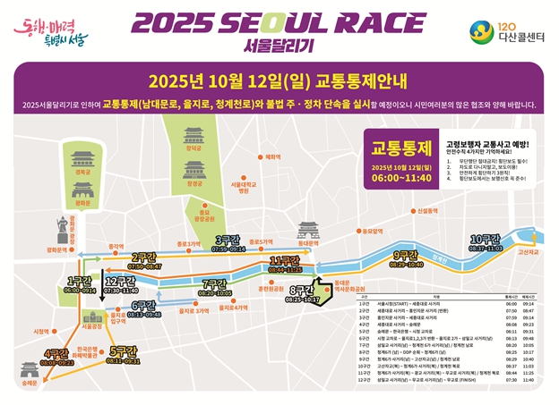 서울시가 ㈜동아일보와 공동주최로 10월 12일 오전 8시부터 정오까지 서울광장 일대에서 1만 2,500명이 참가하는 ‘2025 서울달리기(SEOUL RACE)’를 개최한다. ‘서울달리기’는 2003년 처음 시작해 시민들의 꾸준한 사랑을 받아온 서울 대표 달리기 대회다. 2010년부터는 ㈜동아일보사와 공동 주최하여 서울광장에서부터 청계천 등을 누비는 코스로 운영되고 있다. 이번 대회는 하프 코스와 11km 코스 두 부문으로 진행되며 참가자들은 서울광장을 출발해 종로~동대문~숭례문~을지로~청계천 등 매력적인 도심 명소를 달리게 된다. 하프 코스는 동대문디자인플라자를 경유하며, 11km 코스는 청계천 구간을 제외하고 하프 코스와 동일한 구간을 달려 서울광장으로 되돌아오는 구성이다. 대회 당일인 12일 오전 6시부터 11시 40분까지 남대문로~을지로~청계천로 등 주요 구간별 교통이 통제된다. 다만 시는 대회 참가자 전원이 해당 통제 구간을 통과하면 순차적으로 통제를 해제해 시민 불편을 최소화할 예정이다. 아울러 시민들이 교통 통제 정보를 사전에 충분히 인지할 수 있도록 서울경찰청 등 관계기관과 협조하여 대회 구간에 안내 현수막과 표지판을 사전에 설치했다. 또한 대규모 인파 운집으로 인한 안전사고를 예방하기 위해 안전관리 인력을 배치하고, 관계기관 합동운영본부 및 의료 부스를 설치해 안전한 대회 운영에 최선을 다할 계획이라고 덧붙였다. 구종원 서울시 관광체육국장은 “올해도 아름다운 가을 정취 속에서 청계천 등 매력적인 서울의 명소를 달리며 즐길 수 있는 대회를 마련했다”라며 “대회 당일 도심 교통 통제로 혼잡이 예상되나 무엇보다 안전한 대회가 운영될 수 있도록 시민분들의 적극적인 협조와 양해를 부탁드린다”라고 말했다.