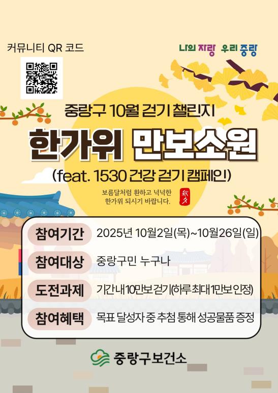 중랑구는 모바일 걷기 앱을 활용한 `온라인 걷기 챌린지`를 10월 2일부터 26일까지 25일간 운영한다. 이번 챌린지는 구민들의 일상 속 걷기 실천율을 높이고, 건강한 생활습관을 유도하기 위해 마련됐다. 중랑구민 누구나 참여가 가능하며, 챌린지 참여를 원하는 구민은 스마트폰에 ‘워크온(WalkOn)’ 앱을 설치하고, 중랑구 대표 커뮤니티 `움직임으로 건강한 중랑`에 가입한 후 참여할 수 있다. 참여자는 운영 기간 내 10만 보 이상을 달성해야 하며, 하루 최대 1만 보까지 인정된다. 구는 목표를 달성한 참가자 중 추첨을 통해 100명을 선정해 모바일 기프티콘 등 성공 인센티브를 당첨자 개인 휴대폰으로 발송할 예정이다. 이번 챌린지는 9월 25일 제정·공포된 `중랑구 걷기 활성화 지원 조례`를 바탕으로 추진된다. 해당 조례는 구민의 걷기 습관 형성과 건강한 생활환경 조성을 위한 제도적 기반을 마련한 것으로, 걷기 좋은 길 발굴, 동아리 운영, 홍보물 및 용품 지원, 인센티브 제공 등을 주요 내용으로 담고 있다. 특히 이번 조례 제정으로 챌린지 성공자에 대한 인센티브 지급 방식이 개선되어, 기존의 보건소 방문 방식 대신 지역사랑상품권이나 모바일 상품권으로 제공함으로써 참여자 편의성과 실용성이 크게 향상됐다.류경기 중랑구청장은 “이번 챌린지를 통해 구민들이 일상 속에서 걷기를 실천하고, 건강한 생활습관을 형성하는 계기가 되기를 바란다”며, “앞으로도 걷기 활성화를 위한 다양한 정책을 지속 추진하겠다”고 말했다.