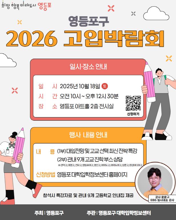 영등포구가 10월 18일 오전 10시, 영등포 아트홀 전시실에서 중학생과 학부모를 위한 ‘2026학년도 고입박람회’를 연다고 밝혔다. 내달 시작되는 고입 원서접수를 앞두고 최선의 진학 선택을 돕기 위해 마련된 자리다.박람회는 ▲2029학년도 대입전형 특강과 ▲관내 9개 고교의 1:1 진학 상담으로 구성된다. 먼저 특강은 EBS 입시 전문 강사이자 교육부 교육정책 자문위원인 윤윤구 강사가 ‘2029학년도 대입 전망과 2026 고교 선택 전략’을 주제로, 진로 설계 방향과 고교 생활에서 필요한 학습 태도 등을 제시한다. 이어 ▲관악고 ▲대영고 ▲선유고 ▲여의도고 ▲여의도여고 ▲영등포여고 ▲영신고 ▲장훈고 ▲한강미디어고 관내 9개 고등학교가 참여해 학교별 홍보 부스를 운영한다. 상담교사와 재학생이 직접 교육과정과 진학 관련 질문 등에 대해 1:1 맞춤 답변을 제공한다.박람회는 중학생과 학부모 누구나 참여할 수 있으며, 당일 참석자 전원에게는 관내 고교별 특징과 특강 핵심을 담은 진학 안내 책자가 제공될 예정이다.이 밖에 구는 자기주도학습지원센터를 통해 최신 대학입학 정보와 진로‧직업체험 등 다양한 교육 프로그램을 운영하고 있으며, 고등학생을 대상으로 ‘1:1 입시 컨설팅’도 제공 중이다. 컨설팅 상담은 희망일 3일 전까지 영등포 대학입학센터 누리집(홈페이지)을 통해 예약하면 된다.아울러 오는 11월 22일 영등포 아트홀에서는 ‘2026 대입 정시 지원전략 설명회’를 개최할 예정이다. 행사와 관련한 자세한 사항은 ‘영등포 대학입학센터’ 또는 구청 미래교육과로 문의하면 된다.최호권 영등포구청장은 “이번 박람회가 학생들이 자신의 진로와 적성에 맞는 고교를 스스로 선택하는 데 도움이 되기 바란다”라며 “미래교육도시 영등포를 위해 모든 구민이 배움을 이어갈 수 있도록 다양한 교육 지원을 지속하겠다”라고 전했다.