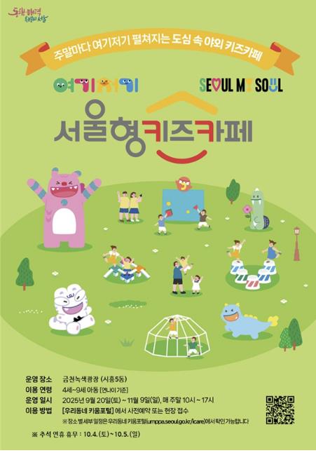 금천구는 오는 11월 9일까지 매주 주말 금천구 녹색광장에서 ‘여기저기 서울형 키즈카페’를 운영한다고 밝혔다.올해 서울시가 시범 운영하는 ‘여기저기 서울형 키즈카페’는 이용 수요가 몰리는 주말에 가족이 함께 소풍처럼 즐길 수 있는 주말 특화형 키즈카페로 일종의 팝업 놀이터다.금천구는 이번 시범운영 대상지로 최종 선정돼, 금천녹색광장에서 운영되고 있다.운영 공간은 500㎡ 규모로, 정원은 회차별 57명이다. 아이들의 조작 능력, 순발력, 균형감각, 대근육·소근육 발달을 돕는 다양한 신체활동 놀이기구와 창작형 놀이기구가 설치돼 있다. 또한 부모들이 쉴 수 있는 전용 대기 공간도 마련해 온 가족이 함께 즐길 수 있도록 했다.운영시간은 오전 10시부터 오후 5시까지며, 2시간씩 총 3회차(①10:00~12:00, ②12:30~14:30 ③15:00~17:00)로 운영된다.이용 대상은 만 4세부터 9세까지 아동이다. 이용료는 아동 1인당 5천 원이며 보호자는 무료다. 다둥이 행복카드 소지 가정(2인 이상 다자녀)은 무료로 이용할 수 있다.한편, 구는 ‘여기저기 서울형 키즈카페’ 외에도 10월 18일과 19일에 열리는 금천하모니축제와 연계한 팝업형 놀이터를 운영해 아이들에게 다양한 체험 기회를 제공할 예정이다.유성훈 금천구청장은 “실내형 서울형 키즈카페와 더불어 주말마다 야외에서 아이들이 마음껏 뛰어놀 수 있는 주말 특화형 놀이공간을 새롭게 준비했다”라며, “앞으로도 금천구가 아이 키우기 좋은 도시로 거듭날 수 있도록 다양한 육아 지원 정책을 적극 펼치겠다”라고 밝혔다.