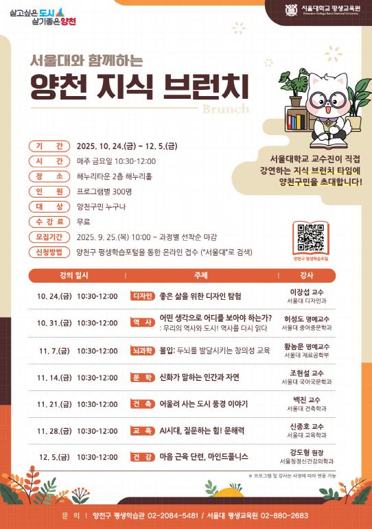 양천구는 구민의 인문학적 소양을 넓히고 평생학습 문화를 확산하기 위해 서울대 교수진이 직접 출강하는 고품격 교양 프로그램 ‘양천 지식 브런치’를 오는 10월 말부터 7주간 해누리타운 해누리홀에서 운영한다고 10일 밝혔다.‘양천 지식 브런치’는 2023년 서울대학교 평생교육원과의 업무협약을 바탕으로 평생교육 진흥을 위해 진행해 온 인문학 릴레이 강좌로, 지금까지 총 14회, 2천여 명이 함께하며 큰 공감을 얻은 바 있다.올해 강연은 주민들의 의견을 반영해 건축, 역사, 디자인, 뇌과학, 문학 등 다양한 프로그램으로 구성됐으며, 오는 10월 24일부터 12월 5일까지 총 7회에 걸쳐 진행될 예정이다.주제는 ▲좋은 삶을 위한 디자인 탐험 ▲어떤 생각으로 어디를 보아야 하는가? 우리의 역사와 도시! 역사를 다시 읽다 ▲몰입, 두뇌를 발달시키는 창의성 교육 ▲신화가 말하는 인간과 자연 ▲어울려 사는 도시 풍경 이야기 ▲AI시대, 질문하는 힘! 문해력 ▲마음 근육 단련, 마인드폴니스(Mindfulness) 등 7개 강좌로 구성됐다.구민이라면 누구나 무료로 참여할 수 있으며, 회차별 300명 정원으로 90분간 운영된다. 양천구 평생학습포털을 통해 온라인으로 접수할 수 있다.구는 이번 강연을 통해 인문학적 지식을 나누고 평생학습 문화를 확산시키는 뜻깊은 계기가 될 것으로 기대하고 있다.한편, 구는 2005년 평생학습도시 지정 이후 올해로 20년째 그 지위를 이어가고 있다. 특히 지난 5월 Y교육박람회 평생학습 축제에서는 ‘평생학습 어르신 백일장’, ‘세바시’, ‘평생학습 거리전시회’ 등 모든 세대가 함께 참여하고 체험하는 배움의 장이 펼쳐졌다.이기재 양천구청장은 “서울대와 함께하는 고품격 평생학습 특강에 많은 구민이 참여해 주시길 바란다”며 “평생학습은 삶의 성장과 발전을 이끄는 원동력인 만큼, 그 가치를 지속적으로 실현하기 위해 최선을 다하겠다”고 말했다.