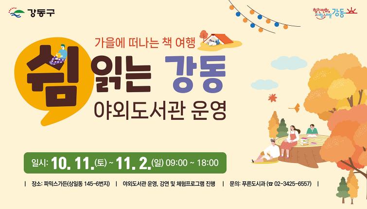 강동구는 10월 11일부터 11월 2일까지 한 달간 파믹스가든(상일동 145-6)에서 주말 야외 도서관 `쉼 읽는 강동`을 운영한다고 밝혔다.‘가을에 떠나는 책 여행’이라는 주제로 열리는 이번 행사에는 행사 기간 매주 토요일 ‘기억 쉼’, ‘일상 쉼’, ‘웰니스 쉼’, ‘함께 쉼’을 테마로 프로그램을 운영한다.10월 11일(기억 쉼) 프로그램으로는 거북선 만들기 등의 체험과 ‘최강보 아티스트’의 비눗방울 마술공연이 진행된다. 특히, 이날 오전 10시에는 ‘큰별쌤’ 최태성 강사의 특강이 함께 진행되어 행사의 첫날을 빛낼 예정이다. 10월 18일(일상 쉼)에는 손수건 만들기 등의 체험과 그림책 독서와 원예 활동을 접목한 ‘그림책 가드닝’ 등의 프로그램이 운영된다. 10월 25일(웰니스 쉼)에는 자연을 탐구하는 프로그램이 진행된다. 꽃·나뭇잎 등으로 책갈피를 만드는 체험은 물론, 숲 해설가와 함께하는 자연 관찰 프로그램인 ‘그림책 숲 해설’이 진행된다. 11월 1일(함께 쉼)에는 샌드위치 만들기 프로그램을 비롯해 참여자가 직접 중고책을 플리마켓을 운영하는 참여형 프로그램들이 진행된다.이외에도 매주 토요일 독서록 통장 만들기·필사·분필 그림 체험 등의 상시 프로그램이 운영되며, 매주 일요일에는 야외 도서관을 조용히 이용할 수 있도록 공간이 개방된다.`쉼 읽는 강동` 행사는 앞서 5월에도 강동아트센터에서 개최되어, 작가 강연과 그림책 독후 활동 등으로 큰 호응을 얻은 바 있다. 당시 체험 프로그램은 사전 신청이 조기 마감될 만큼 인기를 끌었으며, 주민들은 공원을 산책하다가 푹신한 의자에 앉아 잠시 쉬어가거나 가족과 함께 책을 읽으며 여유로운 시간을 보내는 등 즐거운 시간을 보냈다.이수희 강동구청장은 “많은 호응 속에서 프로그램과 체험을 더 확대해 하반기 ‘쉼 읽는 강동’이 한 달간 운영된다”라며 “이번 행사를 통해 더 많은 주민들이 책과 함께하는 일상 속에서 쉼을 누리고 가시길 바란다”라고 말했다.하반기 `쉼 읽는 강동`은 프로그램 사전 신청 개시 하루 만에 마감되며 주민들의 뜨거운 관심을 받았다. 구는 많은 주민이 참여할 수 있도록 현장에서도 프로그램 참여자를 선착순으로 접수할 예정이다. 행사에 대한 자세한 내용은 강동구청 누리집에서 확인할 수 있다.