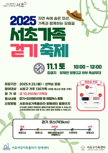 서울 서초구는 서초여성가족플라자 방배센터, 서초구 가족센터와 함께 11월 1일 서울의 대표적인 생태하천인 양재천에서 ‘2025 서초가족 걷기 축제’를 개최한다고 밝혔다.이번 축제는 2023년 처음 개최된 이후 올해 두 번째로 열린다. 올해는 환경과 오리엔티어링(지도와 나침반을 이용해 목표 지점을 찾아가는 야외 스포츠)을 결합한 ‘에코티어링’ 콘셉트로, 서초구의 기후위기 대응에 발맞춰 주민과 함께 일상 속 탄소중립을 실천한다는 취지다.11월 1일 오전 10시부터 시작되는 걷기 행사는 양재천 영동2교 하부 특설무대를 기점으로 ‘영동2교~매헌시민의숲 반환점~영동2교’까지 약 3km를 도는 코스다. 참여자들은 단순한 걷기를 넘어 생태 감수성을 자극하는 특별한 경험을 가족과 함께 즐길 수 있다. 3km 구간에는 각각 올림픽존, 오리엔티어링존, 에코존, 소중해존(양성평등 캠페인), 활동가존 등 5개 존의 총 15개 부스가 운영된다. 특히, ‘오리엔티어링존’은 미지의 지형에 숨어 있는 부스를 찾아 돌아오는 야외형 보물찾기 활동으로 놀이와 환경교육이 어우러진 축제의 대표 구간이다. 이와 함께 체력미션에 도전하는 ‘올림픽존’, 환경보호와 재활용의 중요성을 배우는 ‘에코존’, 소통‧존중‧이해의 문화를 확산하는 ‘소중해존’, 재능나눔 부스가 모인 ‘활동가존’이 흥미를 더할 전망이다. 또, 각 존에 있는 환경을 주제로 한 5가지 도전 과제인 ‘플로깅 빅5 스탬프투어’ 등 친환경 참여 콘텐츠가 한층 강화된 것이 특징이다.참여 가족 모집은 서초여성가족플라자 방배센터 홈페이지를 통해 선착순으로 진행되고 있다. 가족 중 대표자 1명이 신청하면 되고, 참여 인원을 신청서에 정확하게 기재해야 한다. 이후, 걷기 코스를 완주한 가족에게는 메달과 기념품, 행운권 추첨을 통한 푸짐한 선물이 제공된다.전성수 서초구청장은 “지난 ‘2023년 서초가족 걷기축제’에서 보여준 주민들의 큰 호응이 이번 축제 재개최로 이어졌다”며, “올해도 모두가 양재천을 즐겁게 걸으며 온가족이 함께 만들어가는 서초형 친환경 걷기 문화가 정착되길 바란다”고 전했다.