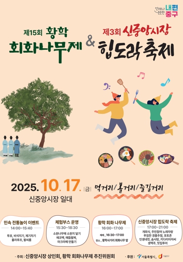 서울 중구 황학동의 오랜 전통을 품은‘황학회화나무제’와 젊은 감각이 살아 있는‘신중앙시장 힙도락(HIP:道樂) 축제’가 오는 17일 오후 2시에 함께 열린다. 두 축제는 2023년부터 연계 개최해, 황학동의 가을을 더욱 풍성히 채우고 있다.축제는 오후 2시, 신중앙시장 어울림쉼터 앞에서 전통 민속놀이로 시작한다. 투호, 제기차기, 비석치기, 팔씨름 등 흥겨운 놀이마당이 펼쳐져 모든 세대가 함께 어울릴 수 있다. 오후 3시 30분부터는 다양한 체험부스가 문을 연다. 소원나무에 소원지 달기, 에코백·매듭팔찌·마크라메 만들기, 솜사탕, 키다리 아저씨, 인생네컷, 포토존 등 다채로운 즐길거리가 가득하다.먹거리도 빼놓을 수 없다. 한입 먹거리 홍보존을 운영해 시장 대표 메뉴를 선보인다. 또한 맛집 스티커북 투어와 오픈 테이블도 운영해 시장 곳곳의 다양한 먹거리를 맛볼 수 있다. 스티커북에 모은 스티커 개수만큼 경품권을 지급한다. 오후 4시부터 5시까지는 200년 넘게 마을을 지켜온 황학사거리 회화나무 앞에서 제례가 진행된다. 올해로 15회를 맞은 황학회화나무제는 황학 회화나무제 추진위원회가 주관하며, 주민이 직접 제례위원으로 참여해 지역의 안녕과 발전을 기원한다. 제례식은 신중앙시장 내 무대화면에 생중계돼 방문객과 상인들도 함께 할 수 있다. 이어 오후 5시부터 신중앙시장 본격적인‘힙도락(HIP:道樂)’축제가 시작된다. ‘힙도락’은 젊은 세대에게 뜨거운 반응을 얻고 있는 신중앙시장의 ‘힙’한 감성과, 음식을 맛보며 즐거움을 나누는 ‘식도락’이 결합한 이름이다. 신중앙시장상인회가 주관해, 축제를 흥으로 가득 채웠다. 무대에서는 캘리 퍼포먼스, 서울실용음악고 학생들의 축하공연과 주민 노래자랑이 이어진다. 또한, 팔씨름과 제기차기 결승전이 열려 1등에게는 20만원, 2등에게는 10만원 상당의 온누리상품권이 주어진다.또한, 경품권 추첨 행사도 마련돼 열기를 더할 예정이다. 스티커북을 통해 획득한 경품권으로 참여할 수 있으며 1등은 플레이스테이션, 2등(2명)은 TV, 3등(3명)은 청소기·밥솥·발마사지기 등 푸짐한 경품이 준비돼 있다.구 관계자는 “신중앙시장은 전통의 향기와 젊은 감각이 조화를 이루는 공간”이라며, “황학회화나무제와 힙도락 축제를 통해 주민과 상인, 관광객 모두가 즐거운 시간을 보내고 신중앙시장과 황학동의 도약을 함께 응원하길 바란다”고 전했다.한편, 신중앙시장은 ‘2023 서울시 디자인 혁신 전통시장 조성사업’ 대상지로 선정돼 매력적인 관광 명소로의 변신을 예고하고 있다.