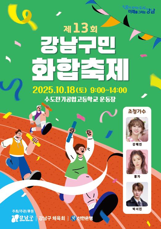 꿈이 모이는 도시, 미래를 그리는 강남구가 오는 10월 18일 오전 9시부터 오후 2시까지 수도전기공업고등학교 운동장에서 ‘제13회 강남구민화합축제’를 개최한다. 구민과 선수단 등 약 7,500명이 참여할 예정이며, 소통과 화합을 바탕으로 건강한 지역사회를 만드는 의미 있는 자리가 될 것으로 기대된다.행사는 점핑공연팀의 식전공연으로 시작해, 국립국악고등학교 학생들의 대취타 공연을 선두로 한 22개 동 선수단의 입장 퍼포먼스가 펼쳐진다. 각 동은 지역별 특색을 살린 창의적인 입장식을 준비해 이목을 끌 예정이다. 이어 개회선언과 축사, 선수단 선서 순으로 본 행사가 진행된다.체육 경기는 단체 줄넘기, 오재미 농구, 대형 바통 릴레이 달리기, 풍선 높이 쌓기, OX 퀴즈 등 총 5종목으로 구성됐다. 세대를 아우를 수 있는 종목 중심으로 구성해 다양한 구민의 참여를 유도하며, 참가자들이 협동심과 팀워크를 발휘할 수 있도록 기획됐다.현장에는 다양한 부대 프로그램도 마련됐다. ▲인생네컷 촬영 ▲페이스 페인팅 ▲핸드폰 꾸미기 체험 등으로 구성된 이벤트 체험존을 비롯해 ▲자생한방병원의 의료 상담 ▲전문가 세무 상담 등을 운영한다. 축제의 흥을 더하기 위해 가수 강혜연, 홍자, 박서진이 출연하는 축하공연도 예정돼 있다.경기 결과에 따라 종목별 점수를 합산해 종합 우승 동을 선정하고, 순위에 따라 강남구체육회에서 상금을 수여한다. 이와 함께 다양한 경품이 마련된 추첨 이벤트를 진행한다.조성명 강남구청장은 “강남구민화합축제가 일상에 활력을 더하고, 이웃 간 소통과 화합을 다지는 계기가 되길 바란다”며 “앞으로도 주민이 함께 즐기고 참여할 수 있는 건강한 공동체 축제를 지속적으로 추진하겠다”고 밝혔다.