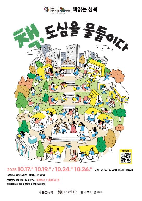 서울 성북구와 성북문화재단이 오는 10월 17일부터 26일까지 매주 금·토·일요일, 성북길빛도서관과 길빛근린공원 일대에서 『서울야외도서관 책 읽는 성북 – 책, 도심을 물들이다』를 운영한다.이번 야외도서관은 지난해와 올해 상반기 오동근린공원에서 큰 호응을 얻었던 ‘숲, 색을 입히다’ 프로그램의 후속으로, 올해는 장소를 길빛근린공원으로 옮겨 새로운 콘셉트로 선보인다. 금요일·토요일은 오후 12시부터 20시까지, 일요일은 오전 10시부터 18시까지 운영된다.‘책, 도심을 물들이다’를 주제로 꾸며지는 이번 야외도서관은 시민 누구나 책과 문화를 일상 속에서 누릴 수 있도록 기획됐다.현장에는 ▲ 성북구 사서가 엄선한 2,000여 권의 책 ▲ 곳곳에 배치된 서가 및 빈백을 활용한 편안하고 자유로운 야외 독서공간 ▲ 다양한 세대와 계층이 함께 즐길 수 있는 다채로운 공연과 독서문화 프로그램 ▲ 영유아 및 가족을 위한 ‘책 읽는 키즈카페’ 등을 만날 수 있다.특히 10월 18일 오후 5시에는 야외무대에서 개장식과 함께 ‘가을의 재즈, 도심의 선율’을 주제로 한 축하공연이 열려 가을 감성을 더할 예정이다. 운영 일정은 기상 상황에 따라 변동될 수 있는 만큼 운영일정 및 세부 내용은 성북구립도서관 누리집을 참고하면 된다. 이승로 성북구청장은 “누구나 쉬어갈 수 있는 도심 속 열린 공간 속 책과 문화를 경험할 수 있는 야외도서관을 마련했다”라며 “푸른 가을 하늘 아래 책과 함께하는 여유를 즐겨보시기 바라며, 앞으로도 구민들이 다양한 문화생활을 누릴 수 있는 ‘책 읽는 성북’을 확대해 나가겠다”라고 말했다.