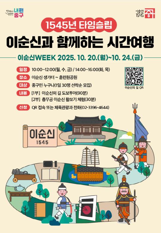 충무공 이순신의 고향, 서울 중구가 이순신 장군의 발자취를 따라 걷는 도보투어와 무예 정신을 되살리는 활쏘기 체험 프로그램을 오는 10월 20일부터 24일까지 운영한다.도보투어는 약 1.3km, 90분 일정으로, 중구 곳곳에 남은 이순신 장군의 흔적을 따라가는 여정이다. 도보투어 후에는 활쏘기 체험도 이어진다.도보투어는 문화관광해설사의 안내로 진행된다. 이순신 장군과 관련된 다양한 일화와 흥미로운 역사 이야기를 들려줄 예정이다. 출발지는 명보극장 앞 생가터 표지석 앞이다. 이후 을지로 골목 안쪽 이순신 장군의 생가터인 신도빌딩을 거쳐 훈련원공원으로 향한다. 훈련원공원은 조선시대 군사 훈련장이자 무과 시험장이던 곳으로, 청년 이순신이 낙마와 부상에도 굴하지 않고 끝내 무과에 합격했던 상징적 장소이자, 이순신 장군의 직장이기도 하다.도보투어 중간에는 전국 최대 건어물 도매시장인 중부·신중부시장도 둘러보며, 을지로와 충무로에 담긴 도시의 역사와 문화 이야기도 함께 만나 볼 수 있다.도보투어 후에는 훈련원공원에서 활쏘기 체험이 이어진다. 궁도협회 소속 전문 강사가 참가자들이 실제 활시위를 당겨보며 전통 무예의 정신을 느껴볼 수 있도록 돕는다.프로그램 참가비는 무료이며, 중구민 누구나 참여 가능하다. 참가 신청은 포스터 내 그림무늬(QR코드) 또는 체육관광과를 통해 하면 된다. 하루 30명씩 선착순으로 모집하며, 월·수·금요일은 오전 10시부터 12시까지, 화·목요일은 오후 2시부터 4시까지 진행된다. 활쏘기 체험은 투어 종료 직후 30분간 이어진다.이와 함께 오는 20일에는 훈련원공원에서 충무초등학교 학생 30여명이 참여하는 ‘소년 이순신 무과시험 체험’이 열린다. 해설과 퀴즈, 활쏘기 등을 통해 이순신 장군의 정신을 배우고, 참여 학생들에게는 ‘소년 이순신 인증서’가 수여된다.중구는 오는 25일 열리는 ‘제1회 이순신 축제’를 앞두고 10월 18일부터 24일까지를 ‘이순신 위크(week)’로 지정했다. 이 기간에 충무공과 관련된 다양한 프로그램이 중구 전역에서 펼쳐지며 도보투어와 활쏘기 체험도 그 일환으로 마련됐다.구 관계자는 “이번 도보투어와 활쏘기 체험은 주민들이 이순신 장군의 발자취를 직접 따라가 보며 중구에 사는 자긍심을 되새길 수 있는 시간이 될 것”이라며 “역사와 전통을 토대로 미래로 나아가는 ‘이순신 탄생지, 중구’의 도시브랜드를 굳건히 세워가겠다”고 말했다.