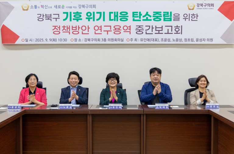 강북구의회 의원연구단체인 ‘강북구 기후위기 대응 탄소중립을 위한 연구회’ (대표의원 유인애)는 지난 9월 9일 의회 3층 의원회의실에서 중간보고회를 열었다. ‘강북구 기후위기 대응 탄소중립을 위한 연구회’는 유인애 대표의원과 조윤섭 부의장, 노윤상 의원, 정초립 의원, 윤성자 의원 등 5명으로 구성돼 있으며, 지속가능한 지역 모델 구축을 통해 ‘더 푸른 강북’을 만들고, 주민이 함께 참여할 수 있는 탄소저감 정책을 발굴·실천하는 데 힘쓰고 있다. 이번 중간보고회에서는 지난 6월 착수보고회에 이어 연구용역 수행기관인 한국도시설계학회 책임연구원이 연구 진행 상황을 발표했다. 발표 내용에는 ▲기후위기 대응 탄소중립·녹색성장 추진 전략 ▲강북구 현황 분석 ▲국내외 주요 사례 분석 등이 포함됐다. 이어 참석한 의원들은 질의응답과 토론을 통해 보완 사항과 향후 추진 방향에 대해 심도 있게 논의했다. 유인애 대표의원은 “기후위기 대응은 더 이상 미룰 수 없는 과제다. 이번 연구회를 통해 강북구 실정에 맞는 현실적이고 지속가능한 정책을 발굴해, 구민들과 함께 실천할 수 있는 기반을 마련해 나가겠다”고 말했다. 강북구의회의 다양한 소식은 의회 홈페이지에서 확인이 가능하다.