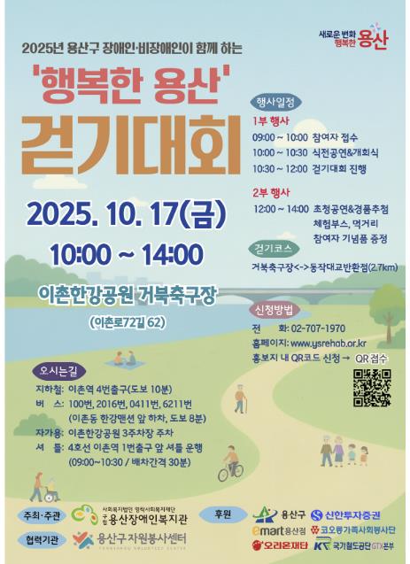 서울 용산구가 오는 17일 오전 10시 이촌한강공원 거북축구장 및 산책로 일대에서, 구립용산장애인복지관 주최로 열리는 ‘2025 장애인과 비장애인이 함께 하는 행복한 용산 걷기대회’를 후원한다.이번 걷기대회는 장애인에 대한 사회적 인식을 개선하고, 지역주민의 이해와 교류를 넓히기 위해 마련된 행사로, 장애인과 비장애인이 함께 어울리며 걷는 소통과 화합의 장이 될 전망이다.행사는 ▲참가자 등록 ▲식전 공연 ▲개회식 ▲걷기대회 ▲축하공연 등으로 진행되며, 500여 명의 주민이 참여할 것으로 예상된다.본격적인 걷기대회 시작 전 숙명여자대학교 응원단 ‘니비스’와 함께 준비운동을 하며 몸을 풀고 부상을 방지할 예정이다.걷기대회 코스는 이촌한강공원 거북축구장에서 출발해 동작대교 아래를 반환점으로 다시 거북축구장으로 돌아오는 왕복 약 2.7km 구간으로 구성됐다. 왕복 1시간가량 소요될 예정이며 반환점 안내 부스에는 급수대가 마련될 예정이다.행사 당일에는 △숙명여자대학교 응원단 △짜이(싸이 모창가수) △트로트 가수 조혜령 등의 다채로운 공연이 무대에 오르며, △문화체험부스 △미니게임 △먹거리 트럭 도시락 등 다양한 부스도 운영될 예정이다.참가를 원하는 장애인과 비장애인 누구나, 전화 및 온라인 사전 신청할 수 있으며 행사 당일 현장 접수도 가능하다.박희영 용산구청장은 “이번 걷기대회가 장애인과 비장애인이 함께 어울리며 서로를 이해하고 소통하는 뜻깊은 시간이 되길 바란다”라며 “앞으로도 용산구는 모두가 차별 없이 행복한 삶을 누릴 수 있는 포용도시를 만들어 가기 위해 노력하겠다”라고 전했다.