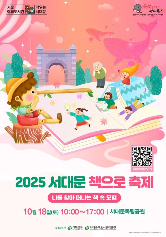 서대문구가 이달 18일 오전 10시부터 오후 5시까지 서대문독립공원 일대에서 책을 통해 가을을 더욱 풍요롭게 하는 ‘2025 서대문 책으로 축제’를 개최한다.‘피노키오와 함께 나를 찾아 떠나는 책 속 모험’이란 주제로 책, 공연, 전시, 체험이 어우러지는 ‘스토리텔링형 독서문화축제’로 꾸며진다.이날 오전에는 버블쇼·마술쇼 공연, 개막식·도서관 우수이용자 시상식, 피노키오 종이인형극 공연이, 오후에는 그림책 ‘모모모모모’의 저자인 밤코 작가와의 북토크 및 어린이 독서골든벨이 이어진다.‘피노키오’를 모티브로 독서와 놀이가 어우러진 제페토 할아버지 목공방 체험, 피노키오 퀴즈 맞히기, 고래뱃속 테마 놀이터 등도 어린이들의 흥미를 더한다.축제 현장 곳곳에는 부스 체험 및 미션 수행과 연계한 ‘황금 코인을 얻어라’, 책 교환 프로그램 ‘책 놓고 책 먹기’ 등의 즐길 거리가 마련되고 푸드마켓도 운영된다.이성헌 서대문구청장은 “이번 축제가 책과 함께하는 특별한 모험의 시간이자 세대가 함께 어울리는 소통의 장이 될 것으로 기대한다”고 말했다.한편 이달 18∼19일 서대문독립공원 잔디밭에는 누구나 자유로운 분위기 속에서 책을 읽고 휴식을 취할 수 있도록 빈백(bean bag) 소파, 캠핑 의자, 북 텐트 등으로 꾸며진 ‘야외도서관’이 운영될 예정이다.