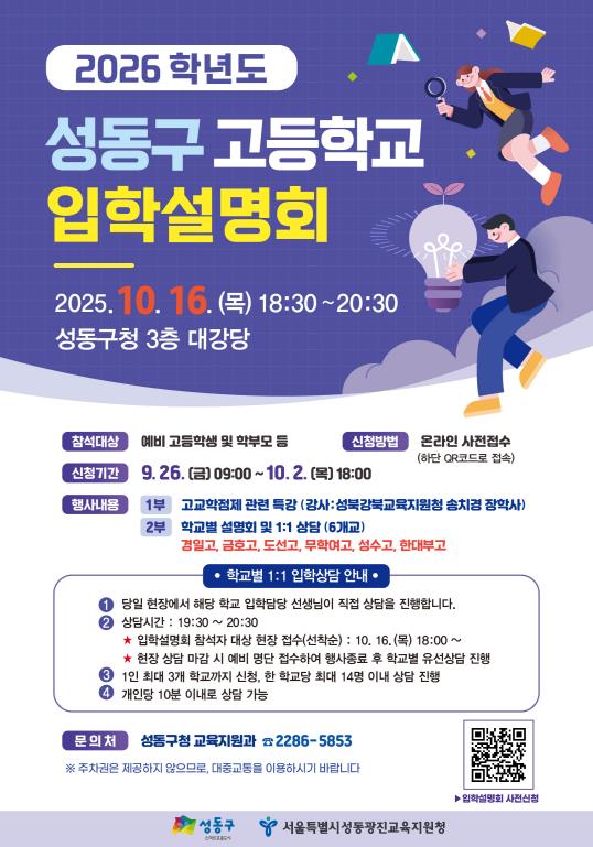 서울 성동구는 오는 10월 16일 오후 6시 30분부터 성동구청 3층 대강당에서 고등학교 진학을 앞둔 학생과 학부모를 대상으로 ‘2026학년도 고등학교 입학설명회’를 개최한다고 밝혔다.이번 입학설명회는 예비 고등학생과 학부모를 대상으로 고교학점제에 대한 이해를 높이고, 지역 내 일반계 고등학교별 입학 정보를 제공하기 위해 성동구와 성동광진교육지원청(교육장 이긍연)이 공동으로 마련한 자리이다.설명회는 ▲ 1부 고교 진학 대비 특강(강사: 성북강북교육지원청 송치경 장학사) ▲ 2부 성동구 학교별 입학설명회 및 1:1 상담(경일고, 금호고, 도선고, 무학여고, 성수고, 한대부고)으로 진행된다.1부 특강은 송치경 장학사가 ‘고교 학점제와 대학 입시의 이해·전략’이라는 주제로 강연을, 2부 학교별 설명회는 각 학교의 입학 담당교사가 학교별 특성, 교육 운영 과정, 진로 진학 전략 등을 안내할 예정이다. 특히 학교별 1:1 상담은 설명회 당일 오후 6시부터 참석자 대상 선착순 현장 접수하며, 학교별 입학 담당교사가 맞춤형 개별 상담으로 진행할 예정이다.설명회는 9월 26일부터 10월 2일까지 7일간 온라인 사전 신청을 통해 참여자를 모집했으며, 사전 신청을 놓친 분들은 잔여석이 있을 경우 현장에서도 참여가 가능하다. 또한 구는 설명회에 참여하지 못한 학부모와 학생들을 위해 설명회 자료와 녹화 영상을 성동구청 홈페이지와 유튜브 채널에 게시할 예정이다.정원오 성동구청장은 “우리 구는 학부모님들과 학생들의 진로·진학, 입시를 위한 설명회와 특강을 꾸준히 마련하고 있다”라며 “변화하는 교육 환경 속에 불안을 해소하고 학생들이 목표하는 꿈을 이룰 수 있도록 지원하겠다˝라고 말했다.