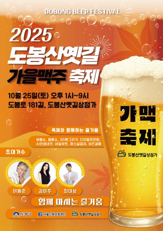 서울 도봉구가 오는 10월 25일 도봉산옛길 상점가(도봉로 181길 일대)에서 `2025 도봉산옛길 가을맥주축제‘를 개최한다.올해로 2회째를 맞은 축제는 주민의 뜨거운 호응에 힘입어 이번에 더 크게 열린다.지난해 도봉로 181길 일부 구간에서 진행된 데 비해 올해는 도봉산옛길 상점가(도봉로181길, 도봉로 891, 도봉산3길 일대) 전역에서 개최된다.늘어난 구역만큼 즐길거리는 더욱 다채로워졌다. 인공지능(AI) 인생네컷, 3차원(3D)펜 체험, 네일아트, 비즈공예, 버블쇼, 퍼스널칼라 체험 등 누구나 참여하고 즐길 수 있는 다양한 부스가 운영된다. 축제의 흥을 돋우는 문화공연도 한층 풍성해졌다. 전 태권도 국가대표이자 현재 배우, 가수로 활동하고 있는 이동준과 ’미스터트롯2’에서 많은 사랑을 받은 트로트 가수 최대성, 김미주의 무대가 준비돼 있다.축제를 찾은 방문객을 위한 이벤트도 마련된다. 상점가 내 점포에서 1만 원 이상 구매한 영수증을 제시하면 맥주 1잔을 무료로 제공한다.오언석 도봉구청장은 “많은 볼거리, 즐길거리가 가득한 만큼 주민 모두가 행복한 시간을 보낼 수 있을 것으로 기대한다.”라며, “지역 상권과 주민이 함께 만드는 이번 축제에서 도봉산옛길의 역사와 정취도 함께 느껴보시길 바란다.”라고 말했다.