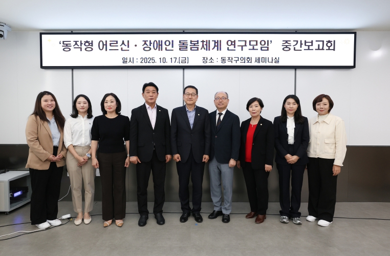 동작구의회 의원 연구단체 ‘동작구 어르신·장애인 돌봄체계 연구모임(대표의원 장순욱)’은 17일 구의회 세미나실에서 연구 용역 중간보고회를 개최했다.이번 연구는 어르신과 장애인에 대한 돌봄서비스가 중복 지원이나 사각지대 없이 효율적으로 제공될 수 있도록, ‘동작형 어르신·장애인 통합 돌봄체계’를 구축하기 위해 지난 6월부터 추진돼 왔다.이날 보고회에는 장순욱 대표의원을 비롯해 정재천 의장, 민경희·신민희·김효숙·이영주 의원과 덕성여자대학교 산학협력단 연구진이 참석했다. 참석자들은 지역 내 돌봄서비스 현황 분석, 보건복지부 및 서울시의 통합돌봄 정책 방향, 그리고 동작구의 제도적 기반 및 서비스 연계 실태를 중심으로 연구 진행 상황을 공유했다. 연구모임은 동작형 통합돌봄체계 구상안을 제시하며, 돌봄서비스를 종합적으로 연계·관리할 수 있는 전담조직 구성과 통합 창구 마련의 필요성을 강조했다.장순욱 대표의원은 “초고령사회 진입과 돌봄 수요의 다양화 속에서, 어르신과 장애인이 지역사회에서 편안하게 생활할 수 있는 돌봄체계 마련이 절실하다”며 “이번 연구가 동작구의 통합돌봄 모델을 구체화하는 계기가 되길 바란다”고 말했다.