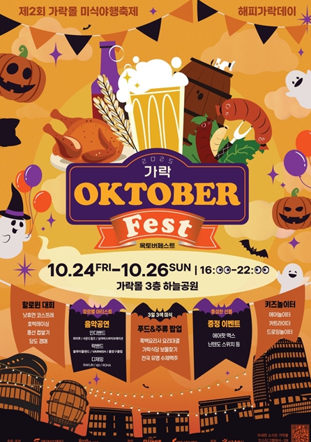 서울시농수산식품공사(사장 문영표)는 오는 10월 24일부터 26일까지 3일간, 가락몰 3층 하늘공원에서 가을 축제 ‘2025 가락 옥토버페스트(Oktober Fest)’를 개최한다고 밝혔다. 올해 옥토버페스트는 맥주와 미식, 음악, 이벤트, 체험 프로그램이 한자리에 어우러진 도심 속 가을 축제로, 남녀노소 누구나 즐길 수 있는 시민 참여형 행사로 진행된다. 행사장에는 전국의 유명 수제맥주 브랜드와 가락몰 대표 식당, 송파구 내 유명 셰프들이 참여해 다양한 미식과 맥주의 조화를 선보인다. 흑백요리사 요리대결, 보물찾기 미션, 미식 챌린지 등 관람객이 직접 참여할 수 있는 프로그램도 운영될 예정이다. 공연 무대에는 최미루, 사운드힐즈, 심야버스바이브레이션, 블루터틀랜드, VARNISH, 물장구클럽 등 다양한 장르의 밴드가 출연하며, DJ RAKUN, ROHA, ejo가 디제잉으로 현장의 열기를 더한다. 공연은 오후 4시부터 밤 10시까지 진행되며, 시간대별로 다른 분위기와 감성의 무대를 선보인다. 가을 분위기를 살린 할로윈 콘셉트 프로그램도 함께 열린다. 할로윈 코스프레, 호박레이싱, 풍선 컵 쌓기, 당도 경매 등 다채로운 경연이 진행되며, 우승자에게는 에어팟 맥스, 닌텐도 스위치, 플레이스테이션, 미식 상품권 등 푸짐한 경품이 제공된다. 또한 가락몰 영수증 이벤트, 맛잘알 스탬프, 사연 이벤트, 미식 이벤트 등 참여형 부대행사도 마련돼 상품권과 경품을 받을 수 있다. 가족 단위 방문객을 위한 ‘키즈놀이터’도 운영된다. 에어바운스, 카트라이더, 드로잉놀이터 등 어린이 체험 프로그램과 포토존, 간식 부스가 함께 구성돼 가족이 함께 즐길 수 있는 공간으로 꾸며진다. 특히 이번 축제의 수익금 일부는 가락시장 내 무료급식소인 ‘하상바오로집’에 기부될 예정으로, 시민이 함께 즐기고 나눔을 실천하는 뜻깊은 행사로 진행된다. 서울시농수산식품공사 관계자는 “가락 옥토버페스트는 시민과 유통인이 함께 만드는 가락몰의 대표 가을축제로 자리 잡았다”며 “올해는 더욱 다양한 프로그램과 풍성한 혜택을 준비한 만큼 많은 시민이 함께 참여해 가을의 낭만과 즐거움을 느끼길 바란다”고 밝혔다.