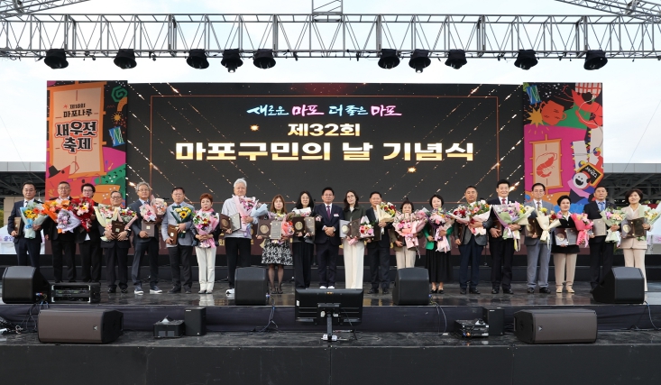 마포구는 ‘제18회 마포나루 새우젓축제’의 마지막 날인 10월 19일 오후 월드컵공원 평화의광장에서 ‘제32회 마포구민의 날’ 기념행사를 열고, 지역사회 발전을 위해 헌신한 구민들의 노고에 감사의 마음을 전했다. ‘제32회 마포구민의 날’을 축하하기 위해 현장에는 박강수 마포구청장과 국회의원 등 내빈 약 2천여 명이 참석해 자리를 빛냈다. 이날 기념식에서 마포구 구민상을 받게 된 구민은 총 20명으로, 시상 부문은 문화상(김기중, 최재홍), 체육상(남현, 홍금순, 황재호), 안전·환경상(김기덕, 김옥자, 어숙희), 교육상(박영희, 홍정연, 마포청소년문화의집), 효행·선행상(김경원, 김두경, 김점동), 봉사·기부상(윤남식, 이병석, 전정미), 지역발전상(권경환, 이석구, 조규식)이다. 구민상은 박강수 마포구청장이 직접 시상했으며, 행사장을 가득 메운 참석자들은 수상자들의 이름이 호명될 때마다 박수로 축하를 전했다. 또한 마포구를 빛낸 자랑스러운 수상자들을 위해 마포구립합창단의 축하 공연이 이어졌다. 박강수 마포구청장은 “구민 여러분 한 분 한 분의 헌신과 참여가 오늘의 마포를 만들었다”라며 “앞으로도 구민이 주인인 마포, 모두가 행복한 마포를 만들기 위해 최선을 다하겠다”라고 말했다.