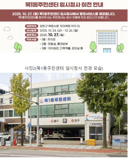양천구는 건립 후 35년이 지나 노후화된 목1동 주민센터 신축을 추진하기 위해, 오는 10월 27일부터 임시청사로 이전해 업무를 개시한다고 밝혔다.임시청사는 목1동 기존 청사 바로 옆 건물인 목동서로 190(목동 919-5)에 위치하며, ▲1층 주차장 ▲2층 민원실 및 동대본부 ▲3층 자치회관으로 운영된다.구는 신청사 완공 전까지 공백 없는 행정서비스를 제공하기 위해 지난 9월 임시청사 리모델링을 완료했다. 노후 마감재 교체, 내부 인테리어 개선 등 쾌적한 민원공간을 조성하고, 자치회관 프로그램 운영을 위한 다목적홀 및 강의실도 마련해 주민 불편을 최소화할 예정이다.특히, 1층 필로티 구조로 인한 접근성 문제를 보완하고자 어르신, 유모차·휠체어 이용자 등 보행 약자를 위한 전용 승강기를 설치해 누구나 편리하게 이용할 수 있도록 했다.한편, 구는 목1동 주민센터 건립을 위해 지난 3월 신청사 부지 매입을 완료하고 9월에는 주민설명회를 열고 청사 밑그림을 공개했다.새롭게 조성될 목1동 주민센터는 연면적 4,943㎡, 지하 2층부터 지상 5층 규모로, 기존 청사보다 약 6배 넓은 복합청사로 건립된다. 2026년 상반기 착공, 2028년 2월 준공을 목표로 추진 중이다.주민센터 외에도 ▲공유주방 ▲평생학습센터 ▲북카페 ▲키즈카페 등 생활밀착형 복합 시설이 더해져 주민 편의성과 활용도가 크게 향상될 예정이다.이기재 양천구청장은 “그동안 공간 협소와 노후화로 주민 불편을 초래했던 목1동 청사를 행정·문화·복지 기능이 융합된 복합청사로 탈바꿈하기 위해 최선을 다하고 있다”며 “신축 청사 완공 전까지 임시청사에서도 기존 수준 이상의 행정서비스를 제공할 수 있도록 철저히 준비하겠다”고 밝혔다.