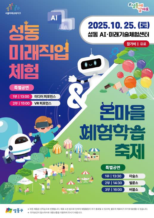 서울 성동구가 오는 10월 25일 성동 AI‧미래기술체험센터 일대에서 `성동 미래직업체험 · 온마을체험학습 축제`를 개최한다고 밝혔다. 이번 축제는 인공지능 시대에 발맞춰 최첨단 미래기술을 직접 체험하는 것은 물론 성동구의 인기 있는 온마을체험학습 프로그램을 한 자리에서 즐길 수 있도록 두 가지 콘셉트로 기획됐다.먼저, AI‧미래기술체험센터(살곶이길 327)에서는 미래 직업 탐방을 테마로 하는‘미래직업축제’가 열린다. 로봇, VR, IoT, 자율주행 등 최첨단 기술을 직접 체험하며, 미래 유망 직업군을 직접 경험해 볼 수 있다. 미래기술체험존에서는 AI 드로잉, 드론 빙고 게임, 클릭봇 인형 구하기 등 7개 프로그램, 미래직업존에서는 AR 미니레이서, IoT 응급구조대, 로봇 축구, 3D펜 굿즈 공방 등 14개 프로그램이 진행된다. 드론체험장에서는 미디어 아트 및 VR을 활용한 특별공연도 펼쳐진다. 특히, 미디어 아티스트로 유명한 피오니 작가의 VR 퍼포먼스는 가상과 현실을 넘나들며, 성동구의 발전상은 물론 더 크게 도약할 성동 AI‧미래기술체험센터의 비전을 생생히 전달할 예정으로 더욱 기대를 모은다. 야외 주차장에는 어린이 바이킹, 디지털 타투, 페이스페인팅, VR 자전거로 만드는 팝콘‧솜사탕 등 놀이형 테마파크가 즐거움을 더한다.한편, 바로 옆 전관원어린이공원 일대에서는 또 하나의 축제인 온마을체험학습 축제가 펼쳐진다. 총 16개 온마을체험학습 기관이 참여하여 태양광 자동차 만들기, 탁본 체험, 해피픽백 만들기 등 다채로운 체험부스를 운영한다. 원어민과 함께하는 글로벌 문화체험, 전통놀이 한마당 등도 함께 즐길 수 있다. 또한, 야외무대에서 펼쳐지는 마술쇼, 버블쇼, 벌룬쇼는 온 가족에게 잊지 못할 추억을 선사할 예정이다. 이번 행사는 오후 1시부터 5시까지 진행되며, 어린이, 학부모 등 성동구민이라면 누구나 참여할 수 있다. 체험부스 프로그램은 별도 사전 신청 없이 현장에서 입장 팔찌를 구매 후 이용할 수 있다. 입장권 수익은 서울사회복지공동모금회에 전액 기부된다.정원오 성동구청장은 “이번 축제를 통해 관내 어린이들이 최첨단 미래기술을 직접 체험하며 다채로운 배움의 기쁨을 누리는 뜻깊은 시간을 보내길 바란다”라며 “앞으로도 AI 디지털시대 미래인재 양성에 구정 역량을 집중하는 한편, 모두가 함께 성장하는 온마을 배움터 조성을 위해 힘쓸 것”이라고 말했다.