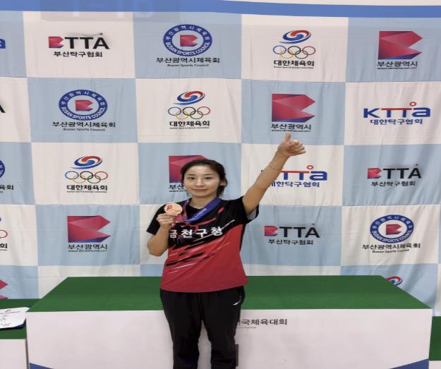 금천구는 제106회 전국체육대회에서 금천구청 여자탁구단 송마음 선수가 여자 일반부 개인전에서 3위를 차지했다고 밝혔다.금천구청 여자탁구단은 10월 17일부터 23일까지 부산광역시 기장체육관에서 열린 체육대회에서 일반부(개인전, 단체전)와 일반부 혼합복식 서울시 대표로 출전해 개인전 부문에서 우수한 성적을 거뒀다.이번 대회는 전국에서 모인 실력 있는 선수들이 치열한 경쟁을 펼친 가운데, 송마음 선수는 우수한 기량을 선보이며 금천구청 탁구단의 위상을 높였다.송마음 선수는 2019년에 금천구청 여자탁구단에 입단해 각종 전국대회에서 꾸준한 성과를 거두고 있다. 올해 ▲ 전국남녀종별탁구선수권대회 복식 3위 ▲ 춘계회장기 실업탁구대회 단식·복식·단체전·혼합복식 1위 ▲ 추계회장기 실업탁구대회 단식 3위·복식 2위·단체전 3위 등 우수한 성적을 거뒀다.금천구청 여자탁구단은 2022년부터 올해까지 서울시 대표로 4년 연속 전국체전에서 입상함으로써 명실상부 탁구 강팀임을 입증했다.유성훈 금천구청장은 “우리 여자탁구단 지도자와 선수들의 열정과 노력이 오늘의 성과로 이어져 금천구의 위상을 높여 자랑스럽다”라며, “앞으로도 선수들이 마음껏 실력을 발휘할 수 있도록 아낌없이 지원하겠다”라고 전했다.