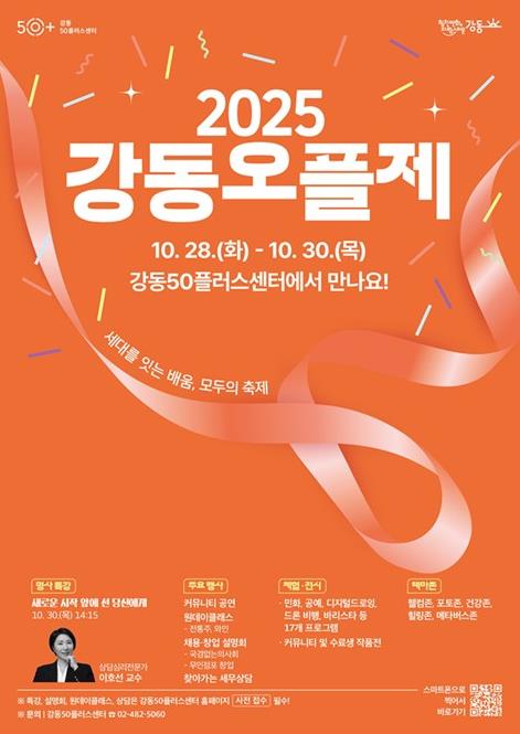강동구는 오는 10월 28일부터 30일까지 3일간, 강동50플러스센터(올림픽로 752, 천호동)에서 ‘2025 강동오플제’를 개최한다고 24일 밝혔다.이번 행사는 ‘세대를 잇는 배움, 모두의 축제’를 슬로건으로, 중장년 세대의 배움과 도전의 결실을 지역사회와 공유하고 세대 간 교류의 장을 마련하기 위해 기획됐다.올해로 4회째를 맞는 ‘강동오플제’는 지난해 1,500여 명이 참여하는 등 큰 호응을 얻었으며, 올해는 46개 프로그램으로 확대 운영해 한층 다채로운 축제로 꾸며진다.주요 프로그램으로는 TV 프로그램 ‘이혼숙려캠프’로 잘 알려진 이호선 교수의 특강 ‘새로운 시작 앞에 선 당신에게’를 비롯해, 국경없는의사회 해외 구호활동가 채용설명회, 무인점포 창업설명회 등 중장년 세대의 관심 분야를 반영한 교육 및 일자리 체험이 진행된다.행사장에는 웰컴존·포토존·건강존·힐링존·메타버스존 등 테마존을 운영해 모든 세대가 함께 즐길 수 있는 다채로운 공간을 선보인다.또한, ‘정성으로 거르는 전통주’, ‘취향으로 빛나는 와인’ 등 원데이 클래스와 함께 1:1 마을 세무상담, 민화·공예·디지털드로잉·드론 비행·바리스타 체험 등 다양한 실습 프로그램이 마련된다.이와 함께 시낭송, 마술, 성악 등 커뮤니티 공연이 축제의 분위기를 더하고, 커뮤니티와 수료생의 작품 150여 점 전시도 진행된다.이수희 강동구청장은 “강동오플제는 중장년의 새로운 도전과 세대 간 배움을 이어주는 의미 있는 축제”라며, “앞으로도 배움의 즐거움을 나누는 행사가 지속될 수 있도록 적극 지원하겠다“고 말했다.