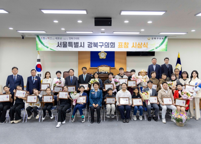 강북구의회는 지난 10월 24일 본회의장에서 평소 헌신적인 봉사와 나눔으로 지역사회 발전에 기여한 모범 구민 95명에게 의장 표창장을 수여했다. 이번 표창 수여식은 평소 성실한 봉사와 나눔으로 지역사회에 선한 영향을 미친 구민들에게 감사의 마음을 전하고자 마련했으며, 1차, 2차로 나눠서 진행했다. 이날 수여식에는 김명희 의장, 심재억, 허광행, 노윤상, 이상수, 최치효, 최미경 의원과 표창 대상 구민, 지인들이 참석해 표창장과 꽃다발을 전달하며 축하와 격려의 말을 전했다. 김명희 의장은 축사를 통해 “강북구의 예산과 주요 정책을 결정하는 신성한 본회의장에서 초등학생부터 어르신까지 강북구를 빛낸 우리 숨은 영웅들을 시상할 수 있게 되어 영광이다. 강북구를 위해 노력해주신 여러분 모두에게 정말 감사드린다.”고 말했다. 강북구의회의 다양한 소식은 의회 홈페이지에서 확인이 가능하다.
