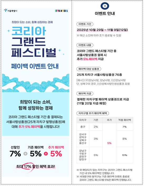 서울시는 오는 10월 29일부터 11월 9일까지 12일간 열리는 ‘코리아 그랜드 페스티벌(Korea Grand Festival)’ 기간 동안, 서울시 25개 자치구 서울사랑상품권으로 결제하면 결제금액의 5%를 추가로 페이백하는 행사를 추진한다고 밝혔다. 추가 페이백은 서울시 25개 자치구가 발행하는 상품권(‘땡겨요’ 등 정책발행 상품권 제외)을 대상으로 한다. 행사 기간 중 결제한 금액의 5%를 별도 신청 없이 결제한 상품권으로 11월 20일에 환급되며, 페이백 이벤트는 자치구별 예산 소진 시까지 진행한다. 현재 페이백을 시행하고 있는 9개 자치구(중구, 용산, 성북, 양천, 강서, 구로, 금천, 관악, 강남)는 기존 2~5%의 페이백에 더해 추가 5%가 지급된다. - 7% (1개 구) : 중구(기존 2% + 추가 5%) - 8% (4개 구) : 용산, 성북, 강서, 관악(기존 3% + 추가 5%) - 10% (4개 구) : 양천, 구로, 금천, 강남(기존 5% + 추가 5%) 서울시는 자치구별 상품권 구매 시 적용되는 7% 구매할인율과 기존 5%, 추가 5% 페이백을 합산하면 최대 17% 할인 효과를 누릴 수 있다고 설명했다. 서울사랑상품권은 ‘서울페이플러스(서울pay+)’ 앱에서 7% 할인된 금액으로 1인당 월 50만 원까지 구매할 수 있으며, 보유 한도는 1인당 150만 원이다. 구매 이후 상품권을 사용하지 않았다면 전액 취소할 수 있고, 현금 구매(계좌이체)의 경우 보유 금액 중 60% 이상 소진한 경우에 한해 잔액을 환불받을 수 있다. 신용카드로 상품권을 구매한 경우, 잔액 환불 및 선물하기는 불가하다. 서울시는 이번 추가 페이백을 통해 기존 페이백을 운영하지 않던 자치구를 포함한 25개 전 자치구에서 혜택이 확대되며, 시민들이 체감할 수 있는 소비 혜택이 크게 강화될 것으로 기대한다고 덧붙였다. 한편 ‘코리아 그랜드 페스티벌’은 ‘희망이 되는 소비, 함께 성장하는 경제’라는 비전 아래, 대한민국 통합 할인 축제로 추진하여 지역사랑상품권 추가 할인과 농·축·수산물, 가전, 생필품 등 다양한 상품들에 대한 대규모 할인도 진행한다. 이해선 서울시 민생노동국장은 “이번 코리아 그랜드 페스티벌에 맞춰 서울시 전체 자치구 상품권의 페이백이 5~10% 확대된 만큼, 내수 침체로 어려움을 겪고 있는 소상공인과 시민들에게 실질적인 도움이 될 것으로 기대한다”며 “서울시는 앞으로도 민생 안정을 위한 정책적 노력을 지속해 나가겠다”고 말했다.
