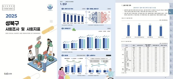 서울 성북구가 24일 구 누리집(sb.go.kr)에 `2025 성북구 사회조사 및 사회지표`를 공개했다.‘성북구 사회조사’는 통계청 승인통계이자 성북구민의 삶의 질과 관련된 관심사와 주관적 의식에 관한 조사로 2011년 5월 첫 조사를 시작해 2년 주기로 실시하고 있다. 올해로 9번째 조사를 마무리했다. 조사 결과는 구민의 생활 만족도와 주요 정책 수요를 반영해 더 살기 좋은 성북을 만들기 위한 구정 정책의 기초자료로 활용한다.올해 조사는 6월 24일~7월 22일 성북구에 거주하는 2,000가구의 15세 이상 가구주 및 가구원 총 4,054명을 대상으로 방문 면접조사로 실시했다.이번 성북구 사회조사 보고서에는 설문을 통해 조사한 11개 분야(△웰빙, △가족·가구, △소득·소비, △일자리, △보육·교육, △교통·환경, △주거·안전, △보건·복지, △문화·여가, △사회참여, △공공행정)와 행정자료를 활용한 1개 분야(△인구)를 포함해 총 12개 분야에 대한 주민 의견을 바탕으로 한 통계자료를 수록했다.주요 조사 결과를 살펴보면, 성북구민의 삶에 대한 만족도는 10점 기준 6.42점으로 대체로 만족하고 있으며, 지역의 전반적인 생활 만족도(6.38점) 또한 높은 수준으로 나타났다. 특히 2023년 조사 대비 다수 항목에서 만족도가 상승하며, 구민의 삶의 질이 전반적으로 향상된 것으로 분석됐다.먼저, 전통시장 이용 만족도는 2023년 대비 6.41점에서 6.85점으로 상승해 지역 상권 활성화 정책의 효과를 보여줬다. 또한, 보육시설 만족도(7.21점 → 7.55점)와 방과후 돌봄 만족도(6.30점 → 7.17점)가 크게 개선되며, 아동·보육 정책이 구민의 체감 만족으로 이어진 것으로 나타났다.보건소 이용 만족도(6.98점 → 7.44점)와 행정민원서비스 만족도(7.56점 → 7.78점) 등 공공서비스 전반의 품질도 향상됐다. 문화·여가, 사회참여 분야에서도 여가생활 만족도(6.00점 → 6.35점)와 자치회관 프로그램 만족도(6.58점 → 7.66점)가 상승하며 구민의 일상 속 만족도가 전반적으로 개선된 것으로 나타났다.성북구의 평균 가구원 수는 2.2명이며, 1인 가구가 38.1%로 가장 큰 비중을 차지했다. 1인 가구 생활에서 가장 불편한 점으로는 아플 때, 응급상황 대처(59.2%)가 뽑혔으며, 필요한 1인 가구 지원 정책으로는 주거안정 지원(55.6%)이 가장 높게 응답됐다.미취학 자녀가 있는 가정에서는 야간연장 보육(45.4%)을 가장 필요로 했으며, 우선되어야 할 정책으로 아동돌봄서비스 등 가정 내 양육지원 서비스 확대(33.8%)를 꼽았다.초·중·고 자녀를 둔 학부모들은 공교육의 비용(6.93점), 시설 수준 및 질(6.62점), 교사 수준 및 질(6.67점), 접근성(6.86점) 등 대부분 항목에서 2023년 대비 만족도가 상승한 것으로 나타나, 공교육 환경 전반의 개선에 긍정적인 평가를 내렸다.교통환경 중 개선이 가장 필요한 사항으로는 교통체증(52.4%), 주차공간 및 주차시설 부족(40.7%), 대중교통 노선 및 운행 횟수 부족(37.3%)을 높은 비율로 응답했다. 동네의 청소 및 쓰레기 처리 관련해서는 대체로 원활하게 이루어지고 있다고 응답했으며, 그 중 생활 및 음식물 폐기물 처리(7.64점)에 대한 만족도가 가장 높았다.성북천, 정릉천 등 도시하천 시설을 이용한 구민은 44.4%이며, 주로 가족(친적 포함)(45.5%)과 함께 걷기, 산책(88.6%)을 위해 하천을 이용하는 것으로 나타났다. 이용자들은 하천 산책로와 자전거길이 자전거길이 잘 되어 있어 이용하기 편리하다(7.01점), 하천에 벤치, 그늘, 휴게 시설 등 쉴 공간이 적정하다(7.00점)고 평가했다.성북구민의 70.5%는 10년 후에도 성북구에 거주할 의향이 있다고 응답했으며, 거주 의향이 없다고 응답한 구민(3.3%)은 그 이유로 직장/사업장 위치(34.0%)와 생활 인프라 부족(24.1%)을 높은 비율로 꼽았다. 성북구의 안전에 대해서는 대체로 안전하다고 인식하고 있었으며, 전반적인 안전에 대한 인식이 2023년 대비 향상된 것으로 나타났다. 한편, 성북구의 도시 안전을 위해 가장 필요한 지원으로는 방범용 CCTV 확충(53.7%) 및 보안등, 공원등 확충(51.7%)을 꼽았다.이승로 성북구청장은 “사회조사는 구민의 생각이 정책으로 이어지는 첫걸음”이라며, “구민의 의견을 구정에 적극 반영해 더 살기 좋은 성북, 함께 행복한 성북을 만들겠다”고 밝혔다.