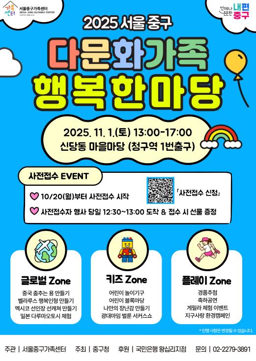 서울 중구는 오는 11월 1일 오후 1시부터 5시까지 신당동 마을마당(청구역1번 출구 옆) 에서 ‘다문화가족 행복한마당’이 개최된다고 밝혔다.행사는 서울중구가족센터가 주관하는 이번 행사는, 다문화가족과 주민 등 400여 명이 한자리에 모여 서로의 문화를 이해하고 어울리는 소통과 화합의 장으로 꾸며진다.참여를 원한다면 포스터 내 그림무늬(QR코드)를 통해 신청할 수 있으며, 신청후 행사 당일 오후 1시까지 현장을 방문한 참가자에게는 소정의 선물도 증정된다.행사 당일 오후 12시 30분부터 참가자 접수와 기념품 배부가 진행되고, 1시부터는 대학생 공연과 개회식이 열리며 축제 분위기를 한껏 달굴 예정이다.오후 2시부터는 다채로운 체험 부스가 문을 연다. 행사장은 △글로벌존(Global Zone) △플레이존(Play Zone) △키즈존(Kids Zone) △에코존(Eco Zone) 등 누구나 즐길 수 있는 프로그램으로 채워진다.먼저, ‘글로벌존’에서는 중국의 춤추는 용 만들기, 벨라루스의 행복인형 만들기, 멕시코의 선인장 선캐쳐 만들기, 일본의 대형 다루마오토시 체험 등 각국의 문화를 직접 체험할 수 있다.또한,‘플레이존’에서는 스톱워치를 활용한 ‘시간을 잡아라’ 이벤트와 만보기를 이용한 ‘아테네 마라톤의 영광을!’ 등 흥미로운 미션형 놀이가 펼쳐진다. 이와 함께‘키즈존’에는 어린이 놀이기구와 블록마당이, ‘에코존’에는 지구사랑 환경캠페인 프로그램이 운영돼 놀이와 환경 실천을 동시에 즐길 수 있다.행사에는 풍성한 경품도 마련돼 개회식과 폐회식에서 추첨을 진행하고, 벌룬 서커스쇼가 행사의 대미를 장식한다.중구의 다문화가족 인구는 해마다 꾸준히 늘고 있다. 2016년 3,130여 명(2.45%)에서 2023년 3,450여 명(2.71%)으로 증가했으며, 서울 자치구 중 세 번째로 높은 비율을 기록했다. 이에 구는 다문화가족이 지역사회에 안정적으로 정착할 수 있도록 서울중구가족센터를 중심으로 다양한 지원정책과 문화 프로그램을 추진하고 있다.특히, 서울중구가족센터는 지난 9월 서울시가족센터가 주관한 ‘2025 서울가족사업 공모전’에서 최우수상을 수상하며 뛰어난 역량을 입증했다. 센터는 이 공모전에서 다문화가족의 ‘놀 권리’에 주목한 `잘 놀면 다행이야` 프로그램을 통해 높은 평가를 받았다.한편 서울중구가족센터는 다문화가족은 물론, 생애주기별 부모교육, 가족상담, 가족돌봄, 문화사업, 아이돌봄서비스 등 다양한 가족과 세대를 아우르는 건강한 가족문화 형성 지원사업을 펼치고 있다.구 관계자는 “이번 행사를 통해 다문화가족과 주민들이 다양한 문화를 즐기며 서로를 이해하고 어우러지길 바란다”며, “다문화가족이 지역사회에 안정적으로 정착할 수 있도록 중구가 든든한 동반자가 되겠다”고 전했다.