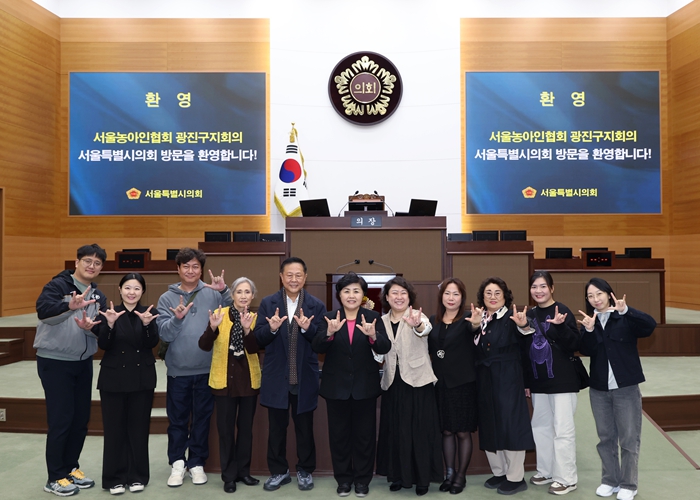 서울특별시의회 보건복지위원회 김영옥위원장(국민의힘, 광진3)은 지난 10월 29일 서울시농아인협회 광진구지회 본회의장 참관 및 의장표창 수여식에 참석해 회원들과 뜻깊은 시간을 가졌다. 이날 행사에는 광진구지회 회원들이 서울시의회 본회의장을 참관하며 의정활동의 현장을 직접 체험하는 시간을 가졌고, 평소 투철한 봉사 정신과 적극적인 사회활동을 인정받아 박미정 씨와 최용희 씨에게 서울시의회 의장 표창이 수여됐다. 김영옥 위원장은 “두 분의 헌신은 청각장애인의 사회 참여와 지역사회 통합의 본보기가 되고 있다”고 격려했다. 한편 김영옥 위원장은 지난 10월 14일 광진구 수어통역센터를 방문하여 “농아인 한글학교 교사들이 수업을 진행하지만 학생들이 수어와 구어 모두 완전히 이해하기 어려운 경우가 많아, 시각적 교육 도구가 절실하다”는 현장 의견을 직접 청취하기도 했다. 김 위원장은 “서울시농아인협회 광진구지회는 청각장애인의 권익 증진과 사회적 자립을 위해 꾸준히 노력해 온 단체로, 오늘의 표창은 그 노력이 사회적으로 인정받은 결과”라며, “서울시와 협의해 수어통역 인력 확충도 제도적으로 뒷받침할 수 있도록 노력하겠다”고 밝혔다. 끝으로 김 위원장은 “박미정, 최용희 두 분을 비롯한 광진구지회 모든 회원분들의 헌신과 노고에 진심으로 감사드리며, 앞으로도 차별 없는 포용사회 실현을 위해 함께 나아가겠다”고 밝혔다.