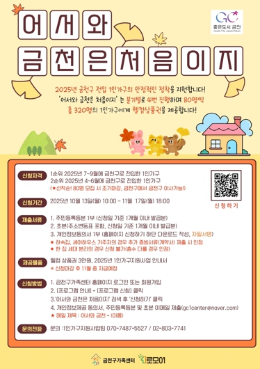 금천구는 2025년 금천구로 전입한 1인가구를 돕기 위해 17일 오후 6시까지 ‘어서와 금천은 처음이지’ 3분기 신청자를 모집한다고 밝혔다. 구는 새롭게 전입한 1인가구가 낯선 지역에서 잘 정착하고 지역의 일원으로 구정에도 참여할 수 있도록 ‘어서와 금천은 처음이지’ 사업을 운영하고 있다. 분기별로 80명, 일 년에 총 320명을 대상으로 1인가구 지원사업 안내서와 다이소 상품권을 제공하고 있다.사업 참가는 2025년 4월부터 9월 사이 금천구로 전입한 1인가구(금천구 내 전입 포함)면 가능하다. 1순위는 7~9월 전입자다. 1순위 모집 인원이 미달될 경우 4~6월 전입자(2순위)에게 신청 기회가 주어진다. 사업 참가는 선착순으로 모집한다. 참가 신청은 금천구청 누리집, 1인가구 누리집, 금천구 가족센터 누리집, GS25 내 1인가구 지원사업 홍보존 ‘1인가구 나랑노랑’ QR코드를 통해 진행할 수 있다.제출 서류는 ▲주민등록등본(신청일 기준 1개월 이내 발급분) ▲초본(주소변동표 포함) ▲개인정보동의서 ▲세대분리 증빙서류(해당 시) 등이다.구는 참가 신청을 마감한 후 11월 중 일괄적으로 다이소 상품권과 1인가구 지원사업 안내서를 제공할 예정이다.금천구의 경우 2025년 9월 기준 1인가구 비율이 53.5%를 차지한다. 이에 다양한 1인가구 지원사업을 진행하고 있다. 특히 ‘혼자 있지 말고 나랑 놀자’는 의미를 담은 1인가구 정책 홍보존 ‘1인가구 나랑노랑’을 통해 지원사업을 알리고 있다. GS리테일과 협업하여 관내 GS25 95개소에 ‘1인가구 나랑노랑’을 운영하고 있다. 현재 정책 제안 이벤트 참여 시 GS25 모바일 상품권 5,000원권을 증정하는 이벤트도 함께 진행 중이다. 유성훈 금천구청장은 “금천구가 운영하는 1인가구 정책을 더 체감하고 참여할 수 있기를 기대한다”라며 “금천구 일원으로 잘 정착할 수 있도록 행정적 지원을 아끼지 않겠다 바란다”라고 말했다.자세한 사항은 금천구청 가족정책과 또는 금천구 가족센터로 문의하면 안내받을 수 있다.