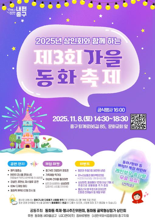 서울 중구 동화동 문화교회(퇴계로86길 85) 일대가 오는 11월 8일 오후 2시 30분부터 6시 30분까지 ‘제3회 상인회와 함께하는 가을동화축제’로 들썩인다.축제는 동화동 축제행사추진위원회(위원장 김영희)와 동화동 골목형 상점가 상인회(회장 정순철)가 공동 주최하며 복지관, 대학교, 교회, 직능단체, 주민 동아리 등 지역 구성원이 힘을 모아 함께 준비했다. 축제에서는 온 가족이 함께 즐길 수 있는 다채로운 무대 공연과 체험, 마켓, 경품추첨 등이 펼쳐질 예정이다.무대는 1부(14:30~16:00)와 2부(16:00~18:00)로 나눠 진행된다. 1부는 어린이들을 위한 즐거운 무대로 꾸며진다. 동화동 자치회관의 ‘어린이 영어 뮤지컬’1기 어린이들이 선보이는 레인보우 뮤지컬을 시작으로, 벌룬매직쇼와 태권도 쇼가 이어진다.특히, ‘어린이 코스튬 콘테스트’가 열려, 동화·만화 속 캐릭터로 변신한 20명의 어린이가 무대 런웨이에 올라 개성을 뽐낼 예정이다. 심사를 통해 7개 부문 1명씩을 선정해 시상하며, 수상자에게는 5만 원 상당의 외식상품권이 주어진다.참여를 원하는 어린이는 행사 당일 오후 2시까지 신청하면 된다. 사전접수는 6일까지 동화동 동내폰(010-5365-9773)으로 진행 중이며 사전접수 후 무대에 오르는 모든 어린이에게 1만 원 상당의 배달앱 쿠폰이 증정된다. 사전신청 어린이들의 코스튬 사진에 대한 인기상 투표도 진행된다. 행사 당일 현장 접수도 가능하다.2부 무대는 흥겨운 공연으로 채워진다. 중구 자치회관 발표회에서 2년 연속 대상을 수상한 한국무용팀의 축하공연을 시작으로, 팝페라 그룹 ‘파스텔로’, 트로트 가수 강설민 씨, SNS 인기가수 류현상 씨의 열정적인 무대가 이어진다. 마지막에는 DJ 한동희의 EDM 파티로 축제의 대미를 장식할 예정이다.행사장 곳곳에는 ‘동화’를 주제로 한 전시와 체험도 가득하다.그림책 인형작가 남정희 씨가 만든 동화 속 주인공 퀼트인형 작품과 미술심리전문치료사 정세희 씨의 동화같은 그림이 전시된다. 또한 동화동 자치회관 ‘연필 스케치’ 실버 수강생들의 풍경화도 함께 선보인다.체험 부스에는 페이스페인팅, 키링 만들기, 전래놀이, 캘리그라피, 고추장 만들기, 장애 공감 체험, 티코스터 퀼트 체험 등 다양한 즐길거리가 가득하다. 또한 중구의 명소와 대표 사업을 배경으로 한 크로마키 포토존도 준비돼 가족과 친구들이 특별한 추억을 남길 수 있다.다양한 마켓도 들어선다. 상인회와 상생하는 ‘상상마켓’에서는 치킨, 생필품, 간식, 반찬 등을 판매하고, ‘동화 줄서는 식당’에서는 오뎅, 김밥, 순대 등 먹거리가 준비된다. ‘한성어패럴 여성패션’에서는 트렌디한 의류를 만날 수 있다. 이 외에도 문화교회 더자람 사회적협동조합이 참여하는 플리마켓, 나눔장터 등이 열려 다양한 물품과 먹거리를 즐길 수 있다. 일부 부스는 현장에서‘동화페이’로 환전 후 이용 가능하며, 수익금은 이웃 나눔과 마을 발전을 위해 사용될 예정이다.이번 축제는 친환경 실천에도 앞장선다. 먹거리 부스에서는 일회용품 대신 다회용기를 사용하며, 생수병 뚜껑 5개를 모아오면 업사이클링 체험이나 전래놀이에 참여할 수 있다. 또한 마켓을 이용하는 에코마일리지 가입자에게는 폐현수막으로 만든 에코백과 장바구니를 증정한다.행사 중간에는 경품추첨도 진행된다. 경품으로 온누리상품권, 외식상품권, 전자레인지, 돼지갈비 세트 등이 풍성히 준비돼 방문객을 기다린다. 또한 어린이들을 위한 이벤도 마련됐다. 어린이가 체험 부스 7개에서 스탬프를 찍어오면 과자를 증정하고, 코스튬을 착용하고 행사장을 방문하면 달콤한 레인보우 솜사탕을 선물로 준다.구 관계자는 “가을 정취 아래 주민과 상인, 온마을이 함께 축제를 준비한 따뜻함과 정성이 담긴 축제”라며 “아이들과 가족, 주민들이 함께 웃고 즐기며 동화같은 하루가 되길 바란다”고 전했다.