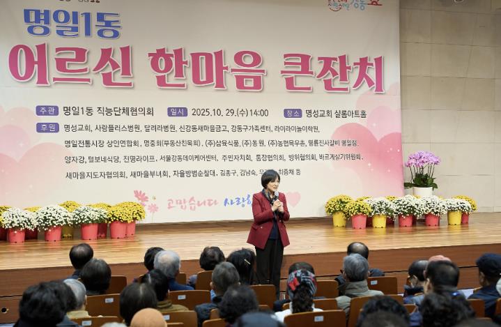 서울 강동구 명일1동은 지난 10월 29일 명성교회 샬롬아트홀에서 관내 어르신 250여 명을 모시고, ‘명일1동 어르신 한마음 큰잔치’를 성황리에 개최했다고 밝혔다.명일1동 직능단체협의회 주관으로 열린 이번 행사는 평생을 지역사회 발전을 위해 헌신해 오신 어르신들께 감사의 마음을 전하고, 함께 소통하며 즐거운 시간을 보내기 위해 마련됐다.행사는 향기로운 어린이집 원아들의 귀여운 합창으로 문을 열었으며, 이어 성가정노인종합복지관 청춘누림 경기민요팀의 흥겨운 무대가 분위기를 한층 고조시켰다. 이후 모범 어르신 표창 수여, 꾸러미 전달, 경품 추첨 등 다채로운 순서가 이어지며 어르신들께 웃음과 즐거움을 선사했다.어르신들에게 전달된 꾸러미는 달려라병원, ㈜삼육식품, ㈜동원, 진명라이프 등에서 후원한 수건, 두유, 죽 등 총 11종의 품목으로 정성껏 준비됐다. 또한, 사랑플러스병원, 신강동새마을금고, ㈜농협목우촌, 명륜진사갈비 명일점 등 여러 기관과 기업이 함께 참여해 풍성한 경품 추첨 시간을 선사하며 큰 호응을 얻었다.김종구 명일1동 직능단체협의회장은 “오늘의 주인공이신 어르신들 모두가 즐겁고 행복한 추억을 남기셨길 바란다”라고 전했다.이수희 강동구청장은 “지역을 위해 헌신해 주신 어르신들께 진심으로 감사드린다”라며, “어르신들이 활기차고 존중받는 노후를 보내실 수 있도록 세심한 복지정책을 펼쳐 나가겠다”라고 말했다.